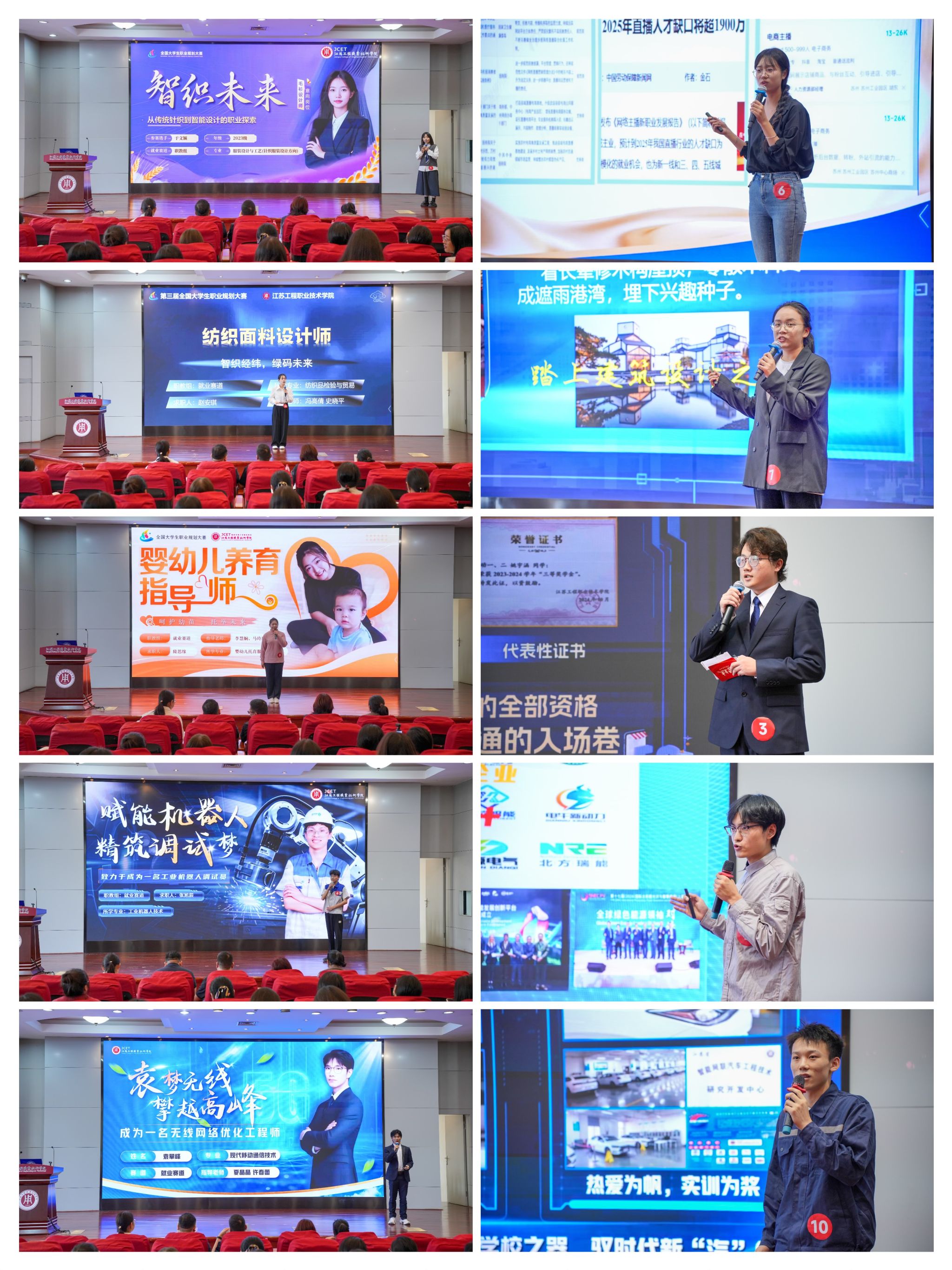 10月15日下午,我校2025年大学生职业规划大赛崇川校区在致知楼报告厅举行。本次大赛邀请了南京财经大学甘诺生涯工作室负责人甘诺、苏州链接力区块链科技有限公司总经理江洪涛、锐捷网络(苏州)有限公司副总经理李德才等五位专家担任评委。校党委委员、副校长尹桂波出席活动,五百余名师生观摩了此次比赛。经过激烈角逐,纺织服装学院张佳、经济管理学院王海琴同学分别获得成长赛道和就业赛道冠军。