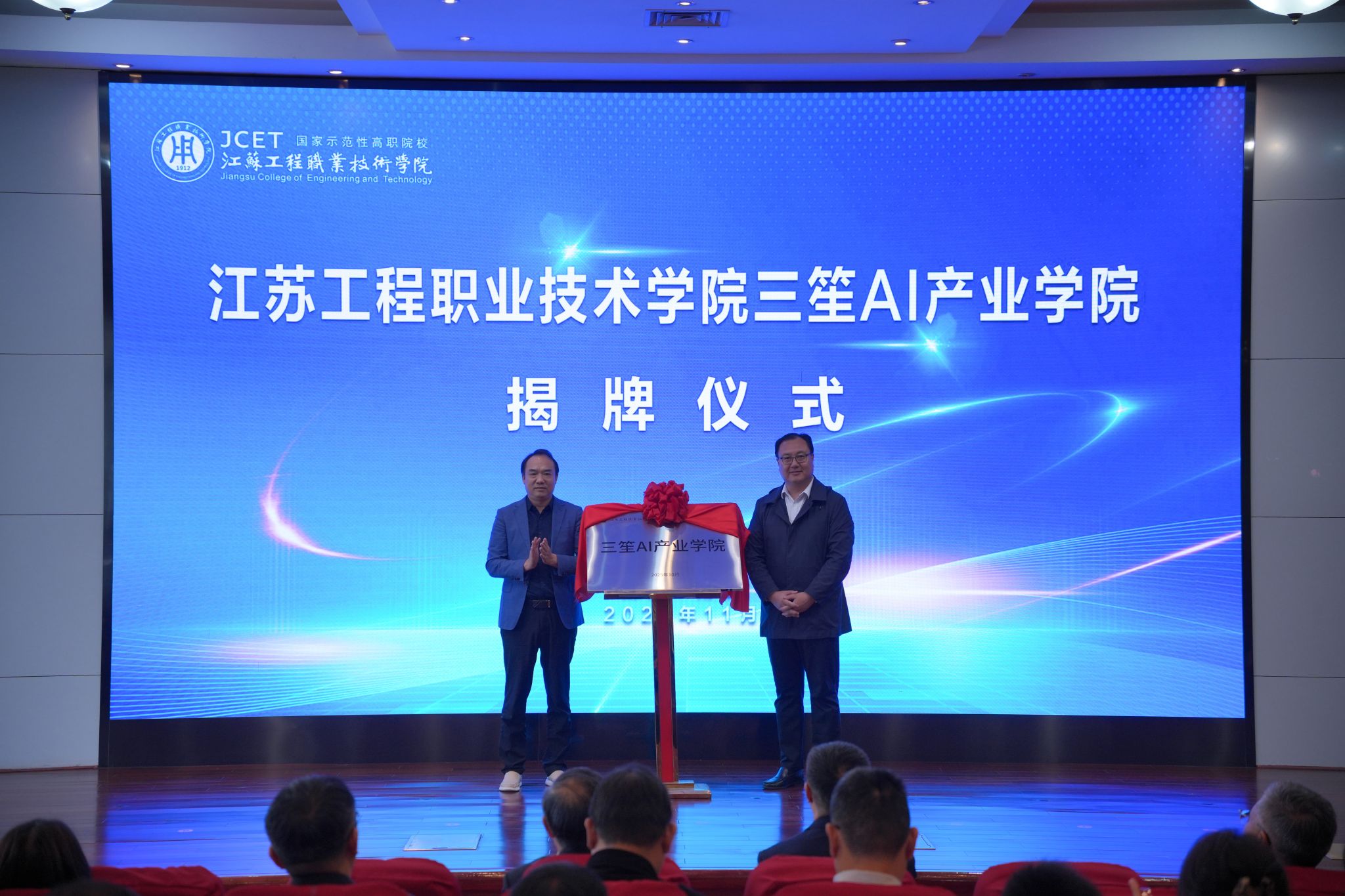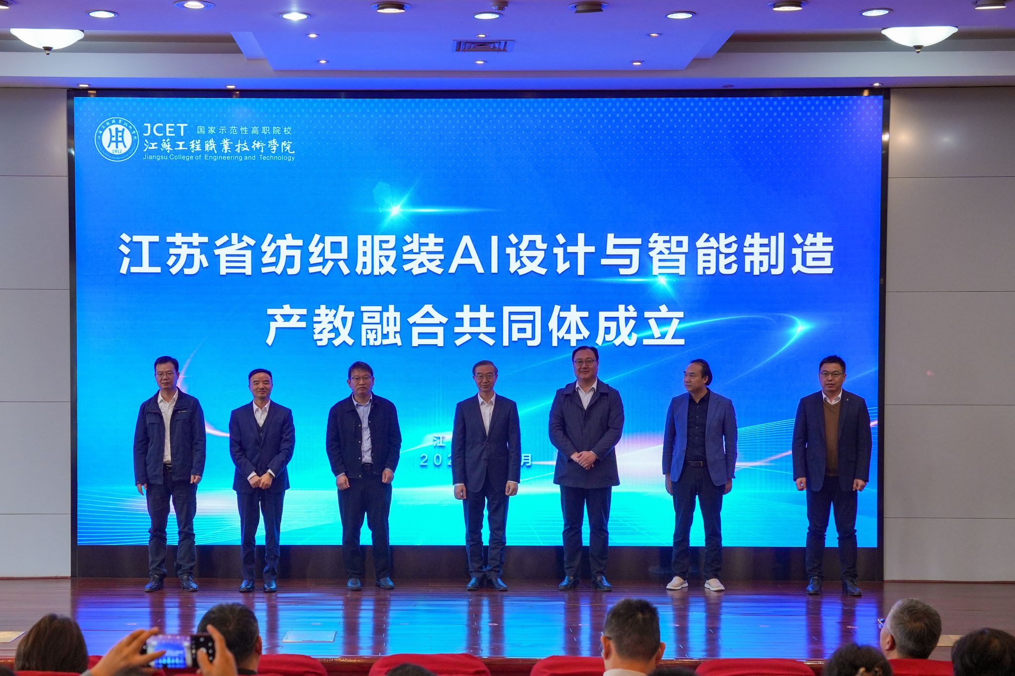 11月1日上午,我校举行江苏省纺织服装AI设计与智能制造产教融合共同体暨三笙AI产业学院成立仪式。副校长尹桂波、江苏金太阳纺织科技有限公司总经理丁可敬共同揭牌。