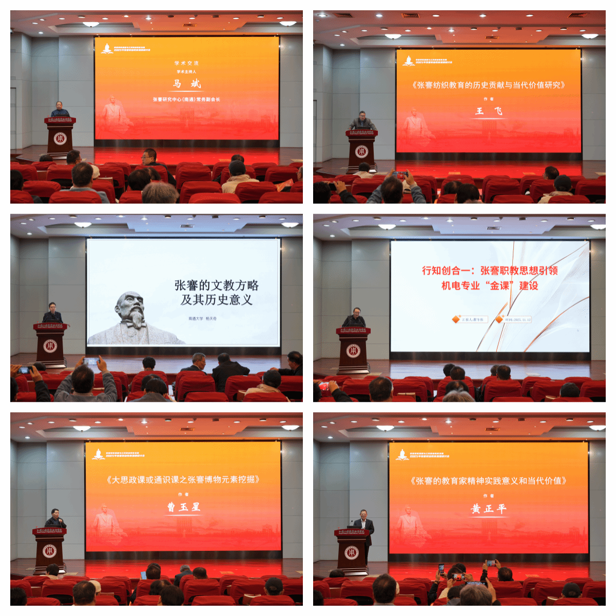主旨报告环节,分别由我校原党委书记秦志林、校党委副书记丛彬彬主持。江苏省教育厅原副厅长、一级巡视员袁靖宇以《以高等教育之强引领江苏高质量发展》为题,阐释了职业教育对区域经济发展的支撑作用;江苏省张謇研究会会长、南京艺术学院原党委书记管向群在《关于张謇教育思想与教育家精神的若干思考》中,从教育家精神视角解读了张謇思想的精神内核与时代张力;江苏省中华职业教育社副主任、江苏省黄炎培职业教育思想研究院执行院长、南京工业职业技术大学原党委书记吴学敏以《张謇和黄炎培的历史交集及职业教育思想》为题,探讨了两位先驱的共识与实践互动;连云港中华职教社常务副主任、连云港中医药高等职业技术学院校长刘旭光在《基于〈读张季子九录〉的解读:张謇教育思想对江恒源教育实践的影响》专题报告中,系统梳理了张謇思想对江恒源职教实践的深远影响,揭示了近代教育思想传承与发展的内在脉络。