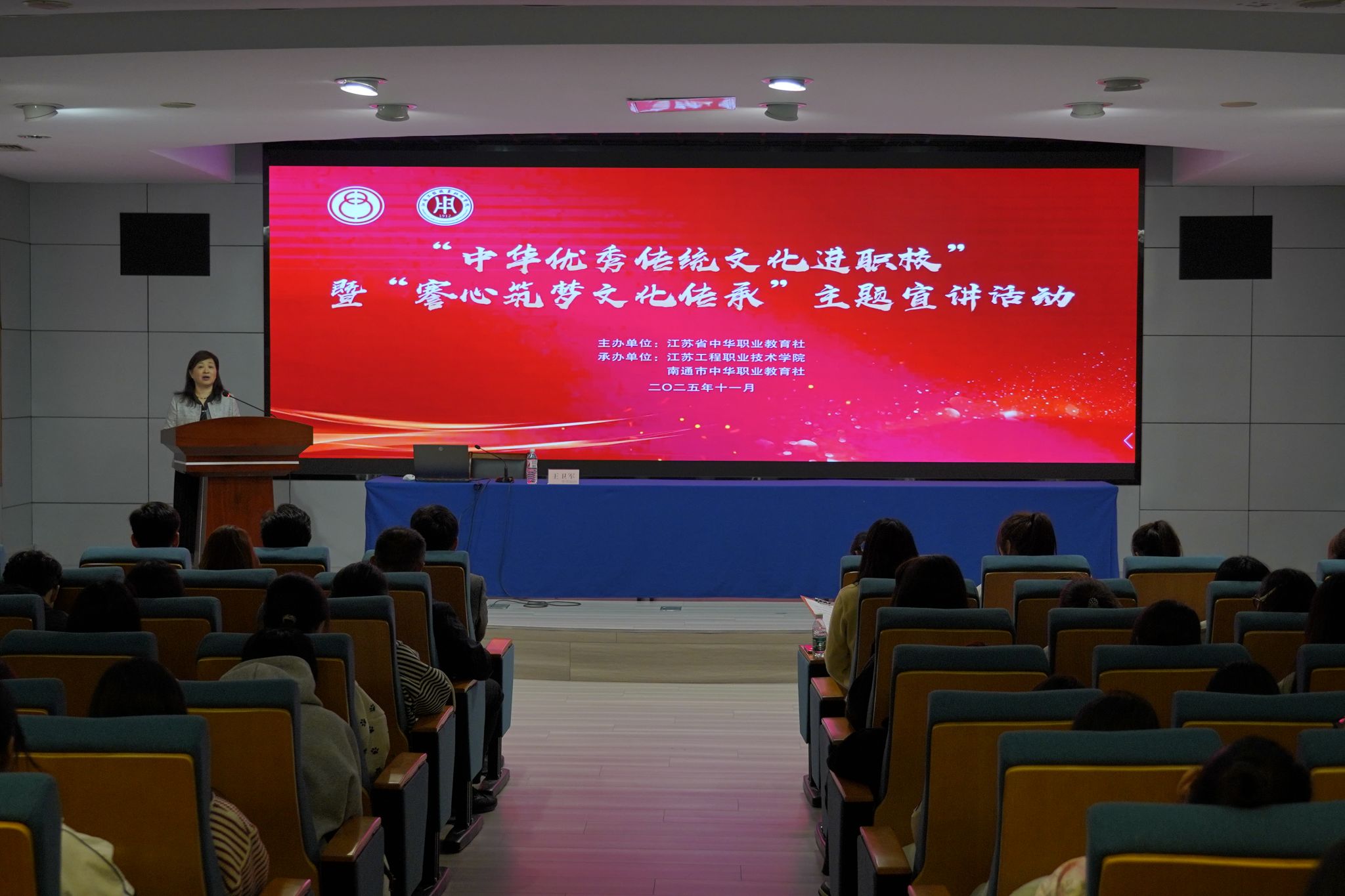 为深入贯彻落实立德树人根本任务,引导职校学生深刻认识、真切感知、自觉传承中华优秀传统文化,11月12日,“中华优秀传统文化进职校”暨“謇心筑梦 文化传承”主题宣讲活动南通专场在我校成功举办。校党委书记钱锁梅、省中华职教社秘书长胡恒锁、市侨办专职副主任顾红菊等出席活动。校党委副书记丛彬彬主持活动。