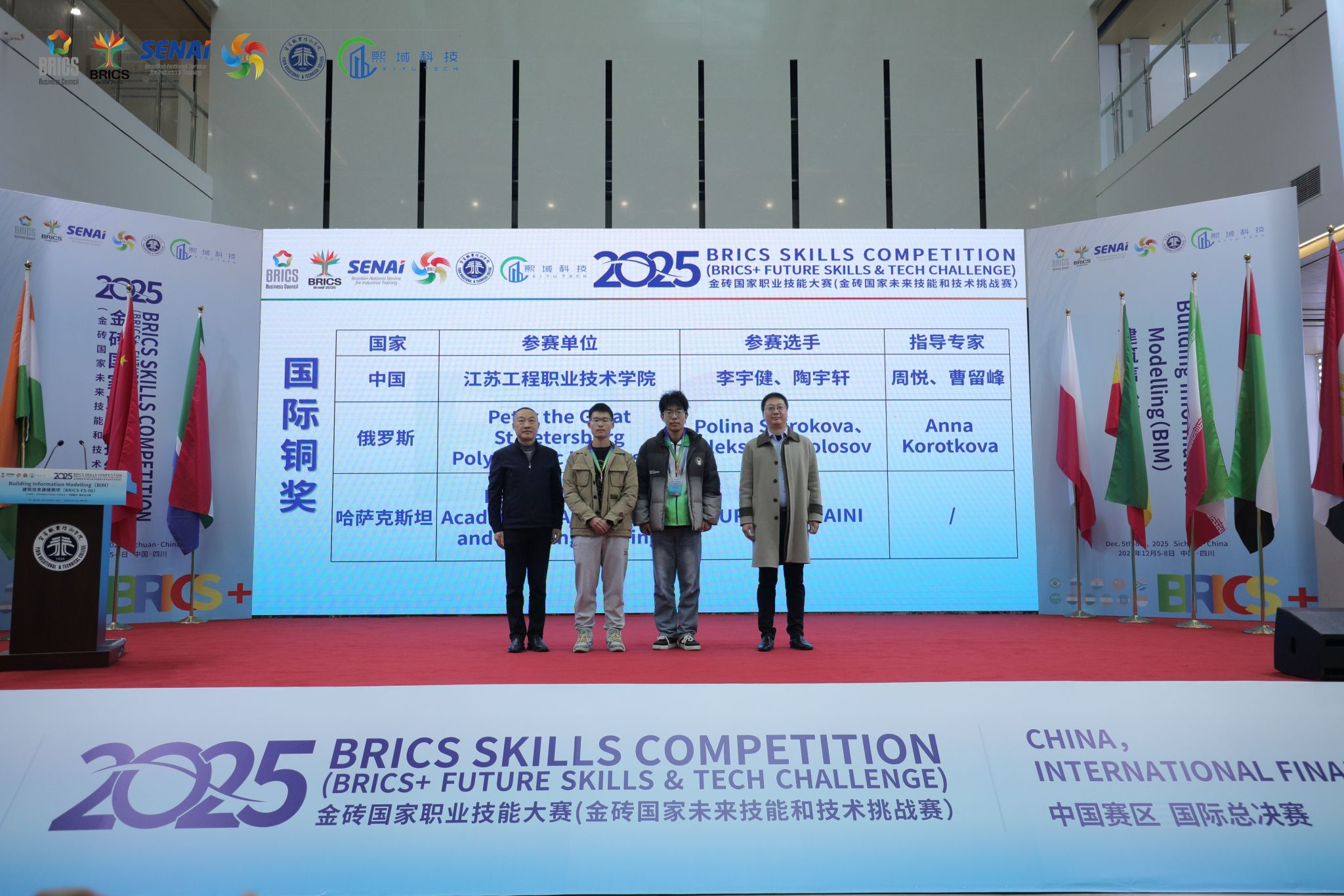 12月5日至8日,2025年金砖国家职业技能大赛建筑信息建模赛项(BRICS-FS-06)国际总决赛在宜宾职业技术学院成功举行。来自金砖国家的53支顶尖代表队齐聚一堂,展开了激烈角逐。我校建筑与交通工程学院参赛选手李宇健、陶宇轩凭借卓越的专业技能和默契的团队协作,取得第五名,成功跻身全球前六(全球奖),荣获总决赛一等奖,成为江苏省唯一获此殊荣的队伍。