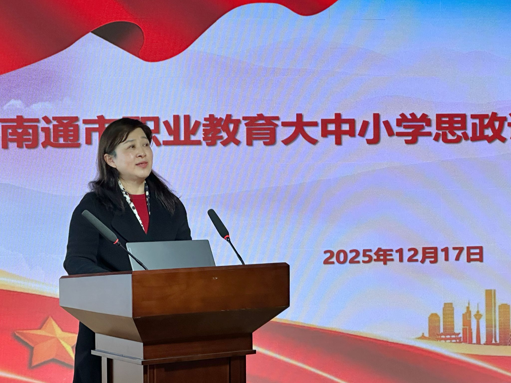 校党委副书记丛彬彬致欢迎辞。作为联盟牵头单位代表,她回顾总结了南通市职业教育“大中小学思政课一体化”联盟一年中的主要工作与成果,并强调联盟始终以“贯通学段、专思融合”为路径,推动思政教育与职业素养、地方产业深度融合。
