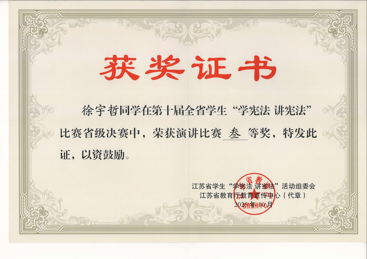 近日,江苏省教育厅办公室下发了《关于公布<第十届全省学生“学宪法 讲宪法”活动结果>的通知》。我校24级建筑与交通工程学院学生徐宇哲(指导教师:徐保玮)获演讲比赛三等奖,实现了学校在该项赛事中获奖“零的突破”,也是学校依法治校工作的一项标志性成果。