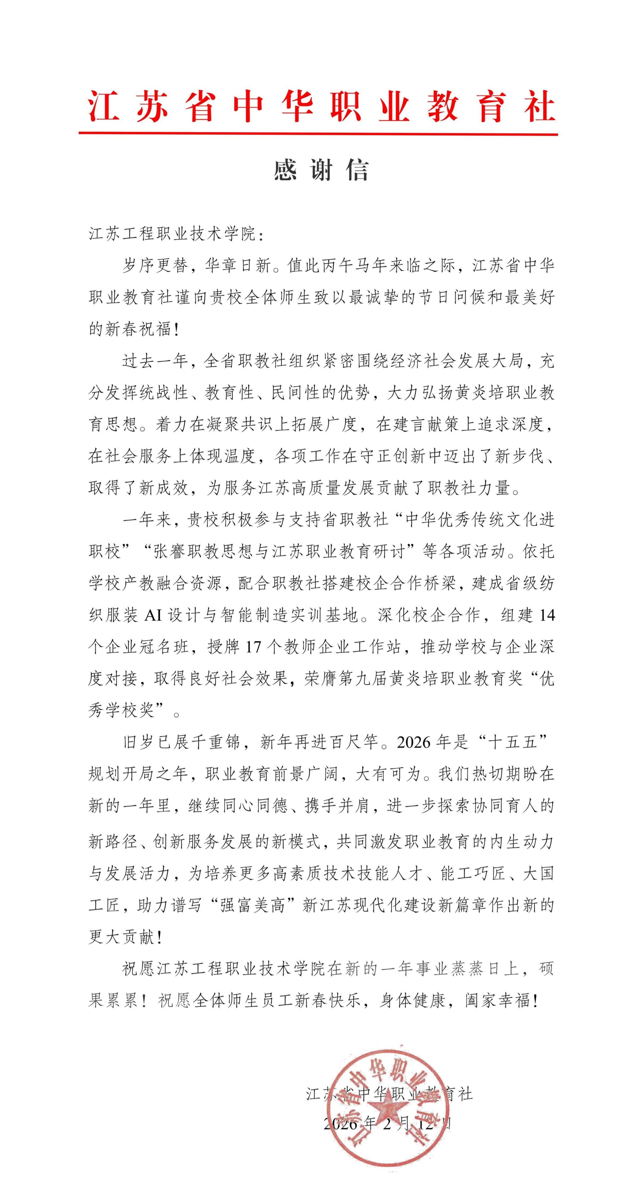 2月12日,江苏省中华职业教育社向我校发来感谢信,向全体师生致以最诚挚的节日问候和新春祝福,高度肯定我校过去一年深耕职业教育、深化产教融合、服务区域发展的亮眼成效,对我校与省职教社协同助力江苏职业教育高质量发展的实践给予充分认可。