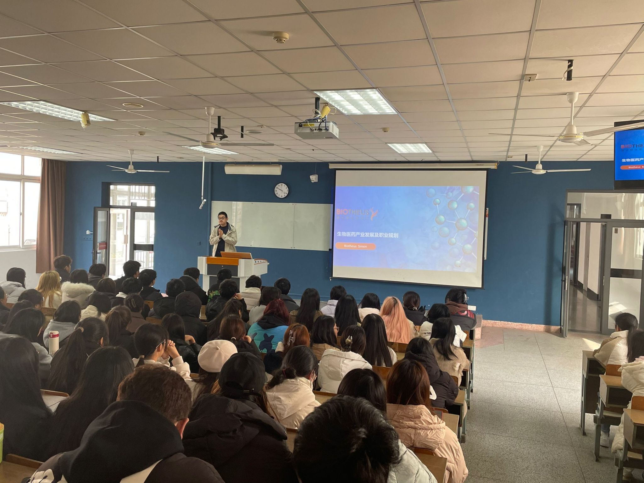 为了切实提升生物制药专业学生对生物医药行业发展认识,不断提高制药学生的职业发展规划能力,逐渐加深在校学生对生物制药工作岗位的熟悉,12月4日纺织服装学院邀请普米斯生物技术有限公司人力资源高级总监陈辉先生,面向2022级和2023级所有制药学生举行了“企业专家”进课堂的活动。