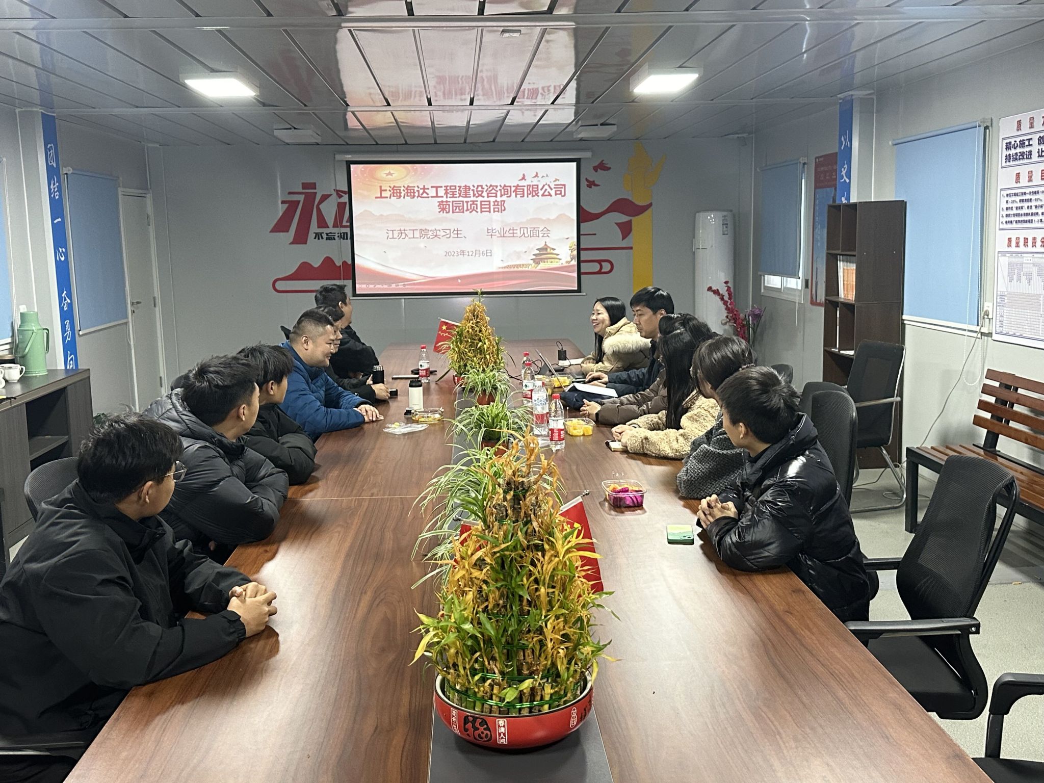 为落实学校人才培养方案,促进学生高质量就业,12月6日,建筑工程学院党总支书记白林、建工技术教研室主任袁东进、就业辅导员李文君、杜秦一行前往上海海达工程建设咨询有限公司进行实地走访调研,在企业挂牌建立“毕业生就业基地”,并看望慰问了在企业实习的建工学院2021级学生及部分校友。
