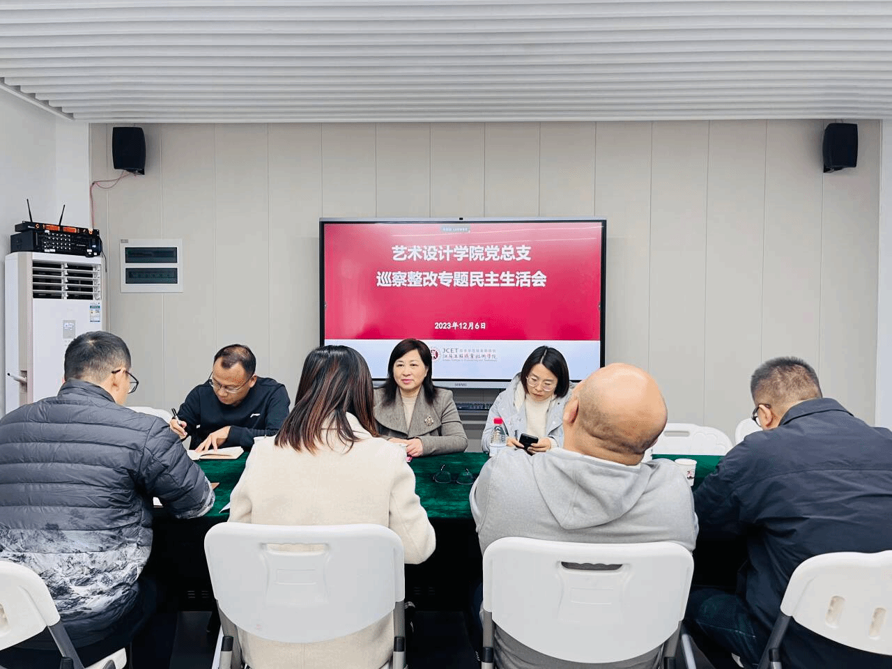 12月6日下午,艺术设计学院党总支在有恒楼二楼会议室召开巡察整改专题民主生活会,学院领导班子全体成员参加会议。校党委委员、副校长丛彬彬到会指导并作点评讲话,校党委第三巡察组副组长储玲和校纪委委员李强出席会议。会议由学院党总支书记彭曼主持。