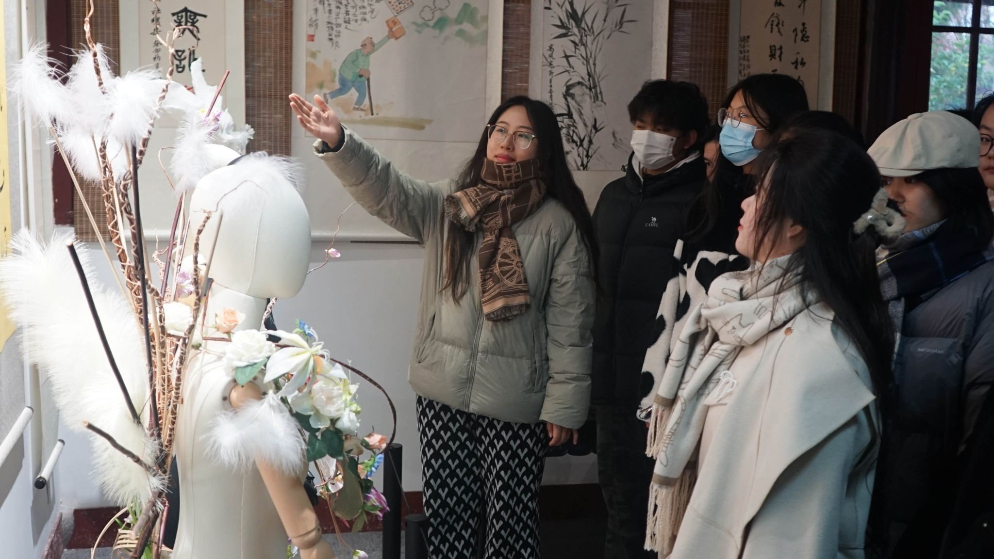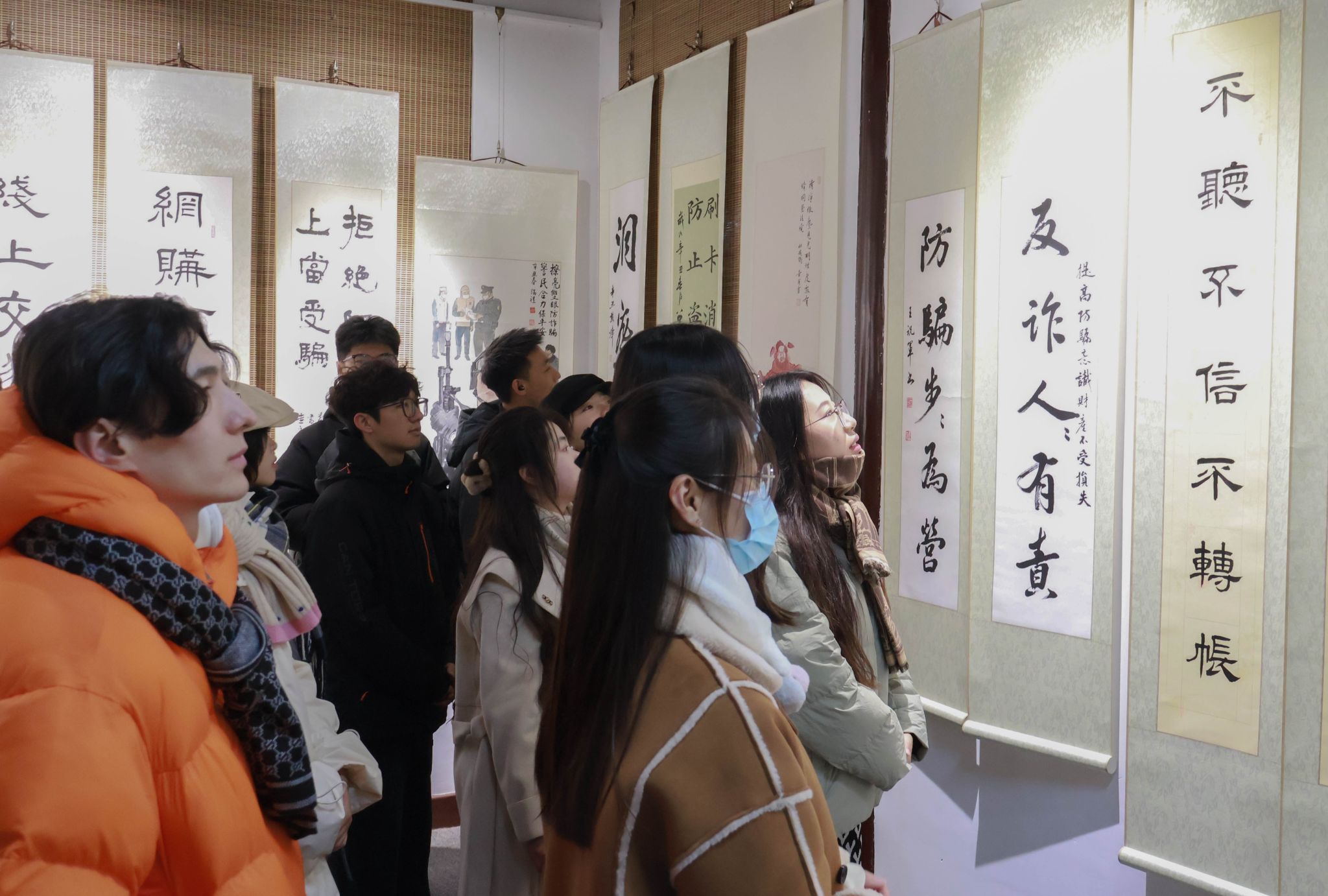 12月15日下午,艺术设计学院辅导员许照绮带领20名学生代表前往南通博物苑味雪斋参观了一场别开生面的反诈文化艺术作品展。展览由市公安局崇川分局内保大队、新城桥派出所联合南通博物苑主办,旨在通过书画、工艺美术等文艺形式,向广大群众传递反诈宣传的理念,进一步增强群众的安全意识。