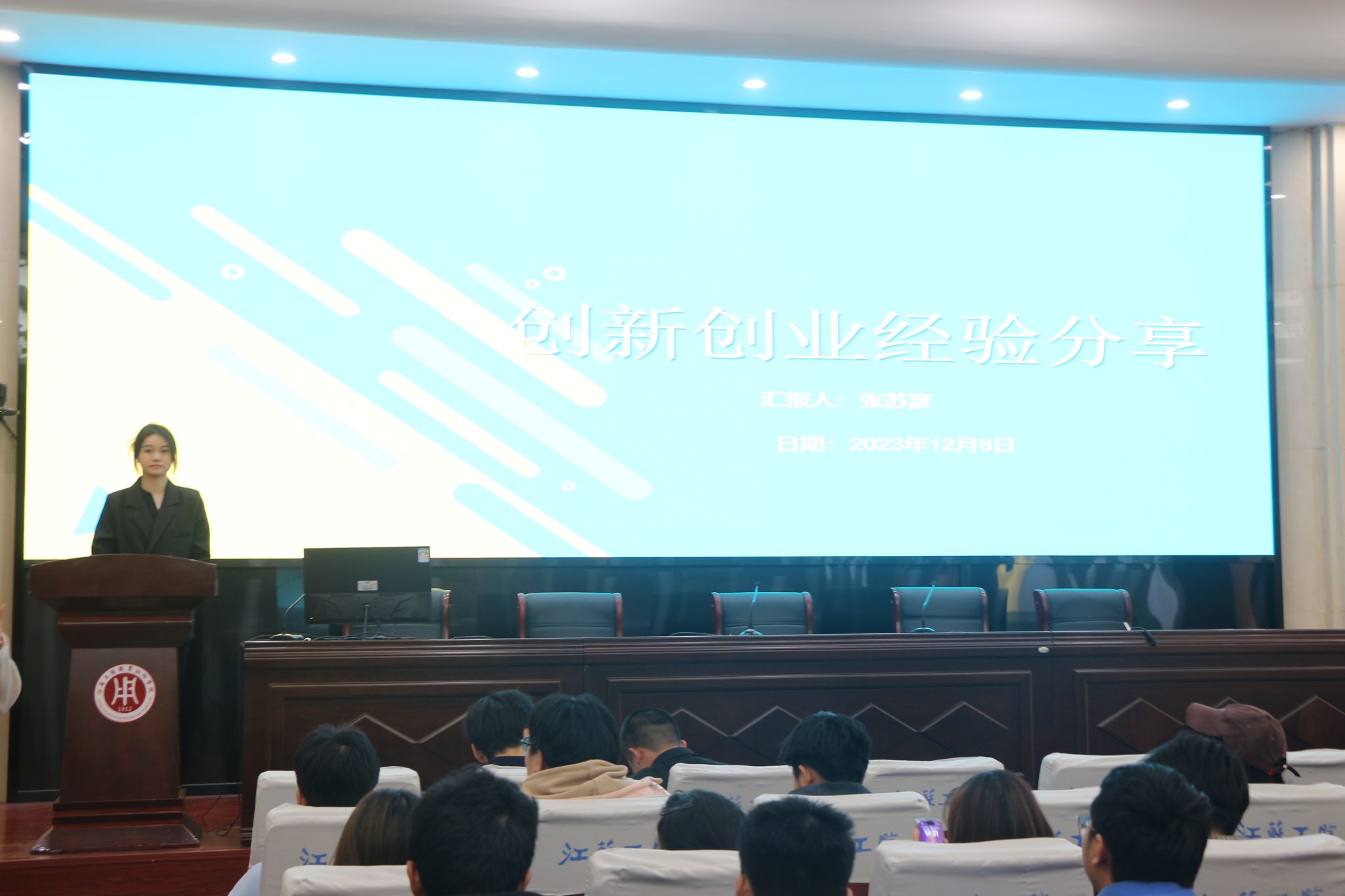 来自22电商七班的张苏彦是“聚博纳米科技”团队成员之一,她所在团队曾获第十二届“挑战杯”江苏省大学生创业计划大赛铜奖、2022年江苏省职业院校创新创业大赛二等奖等,她鼓励同学们投身创新创业,掀起科创风潮。22轨道运营一班的蒋宗意是“武动童心—助力乡村留守儿童身心健康的践行者”项目团队负责人,他以“我敢闯 我会闯”为主题,从五个维度分享了互联网+红旅赛道的参赛要点。22汽车技术一班的丁笠轩所在团队获得第十八届“挑战杯”全国大学生课外学术科技作品竞赛江苏省选拔赛黑科技专项赛行星级作品,他目前发表sci论文1篇,他以“大有可为”为题带领同学们领略了挑战杯比赛的参赛历程。22城轨运营三班蒋鑫是学院团总支副书记,她讲述了今年在暑期社会实践志愿服务活动中的所见所感以及团员青年社区报到的真切感受,她号召团员青年积极参与志愿服务,前往祖国需要帮助的地方。