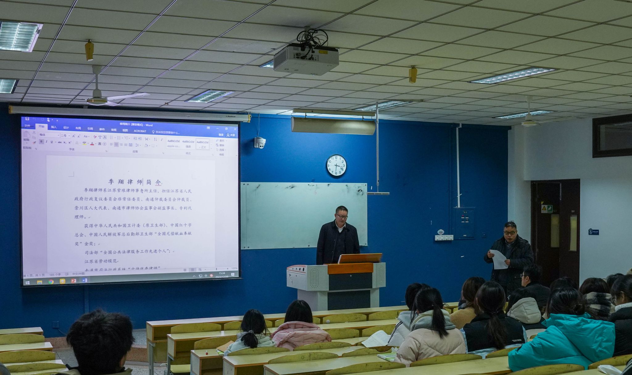 为认真贯彻落实党的二十大精神,大力弘扬宪法精神,并且落实上级教育主管部门关于地方党政领导干部、企事业单位负责人、社科理论专家、各行业先进模范等上思政课讲台的要求,马克思主义学院于12月20日下午特邀司法部“全国公共法律服务工作先进个人”、江苏省劳动模范、南通市司法行政系统“十佳优秀律师”、江苏紫琅律师事务所主任季翔走进《思想道德与法治》课堂,作《维护宪法权威》的专题教学。马克思主义学院院长王飞主持本场教学活动。