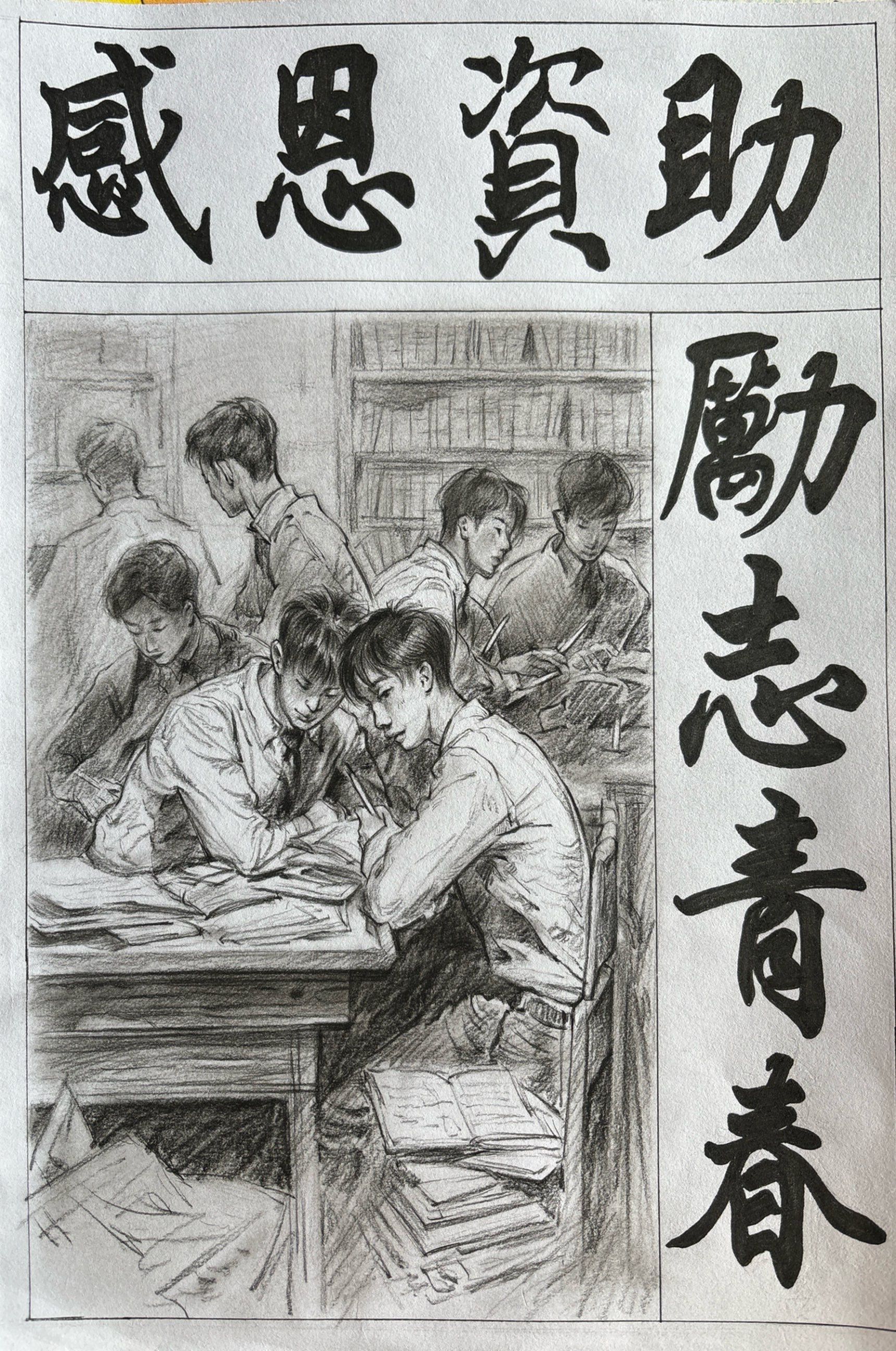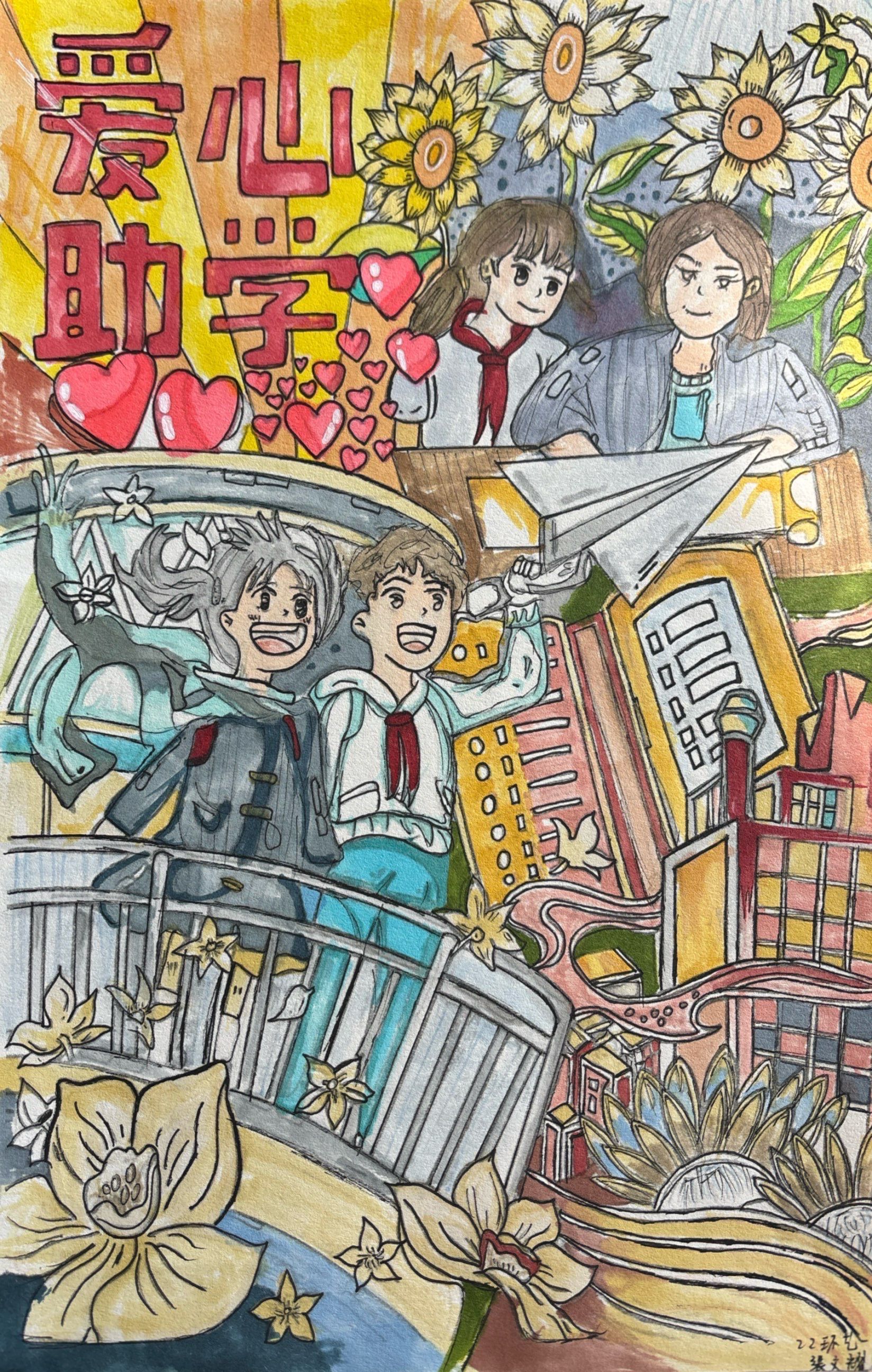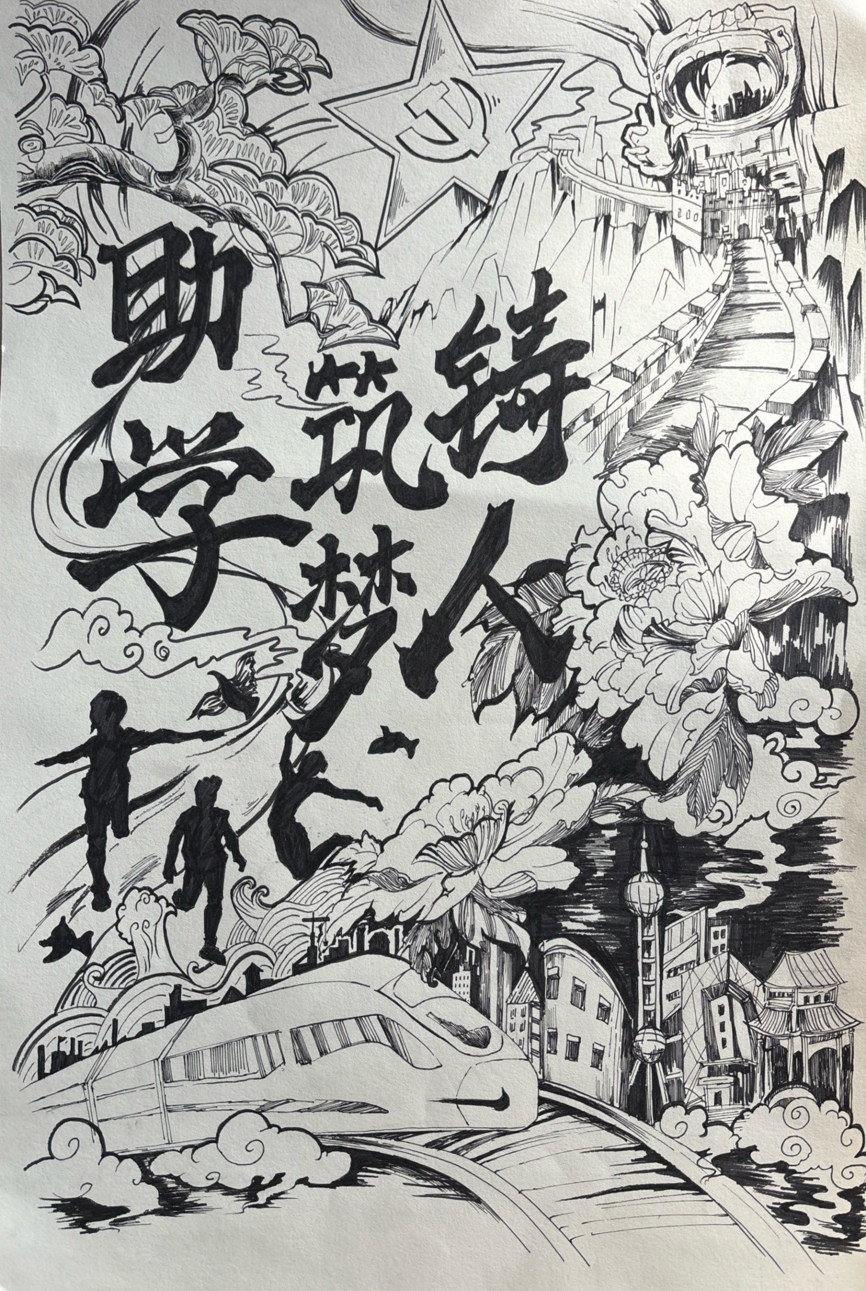 一等奖获得者22环艺一班张文耀同学《迎“未来”》以学生的满脸笑容,扬起的围巾,盛开的花朵为元素,寓意受助学生如同向日葵一样,向着祖国的阳光,奋力前行;画面中五彩缤纷的颜色,更是象征着受助学生在国家助学政策的推行下,肆意生长。22产品三班苗佳旭同学《点燃希望,助力追逐梦想》以水元素为铺垫,以“强国有我,谁的青春不奋斗”为口号,以“助学.筑梦.铸人”为元素,以“宣传国家资助政策,赞美党和政府情系民生”为主题,表达莘莘学子要感恩国家,与祖国同舟共济的信念。