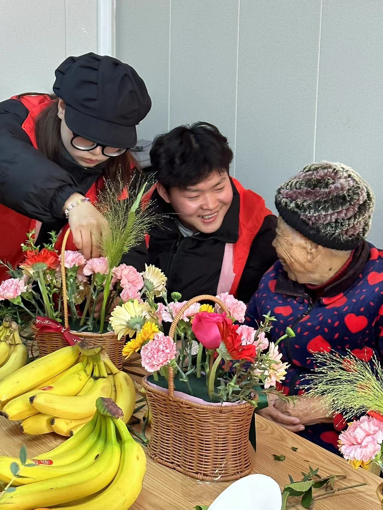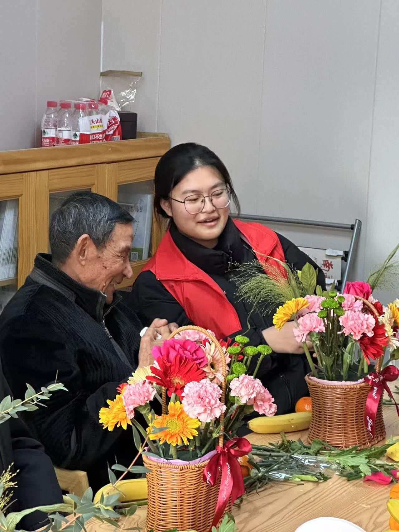 活动中,大学生志愿者们带着水果,陪老人唠家常,倾听老人心声,带他们一起做手势舞。老人们围坐在一起,手中拿着鲜花和绿叶,一边与志愿者交流着插花的技巧,一边分享着自己的故事。志愿者们还为老人们献上了精彩的歌舞表演,让在场的每一位老人都感受到了节日的欢乐和温暖。志愿服务队的成员们纷纷表示,参加志愿服务增强了他们敬老爱老、感恩他人、回报社会的意识,真正的感悟到了“孝”字的含义。