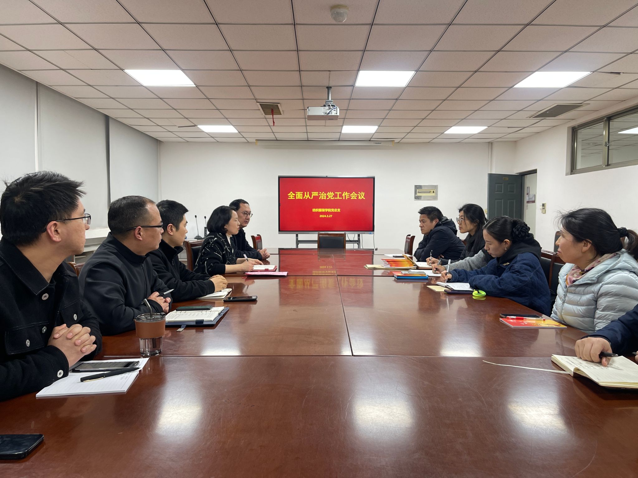 3月27日下午,纺织服装学院党总支在强毅楼604召开全面从严治党工作暨中心组理论学习会议。学院全体党总支委员、各教研室主任、各支部书记、支部委员参加了会议,会议由学院党总支书记夏爱萍主持。