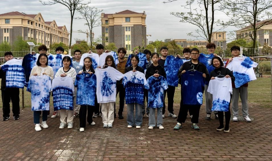 活动中,高月梅详细讲解了扎染技术的历史渊源、制作流程和注意事项,让大家对扎染这一古老的染色技艺有了更为全面的认识和了解。在高老师的指导下,同学们纷纷动手尝试,逐渐掌握了扎染的基本步骤和技巧。同学们在方阵服装上进行设计,从圆形扎法、斜线扎法、螺旋扎法等各种方法捆扎布料,到染料挑选,最后再到浸染、晾晒,每一个步骤都充满了挑战与乐趣。经过一个小时的动手制作,同学们完成了扎染作品,大家互相探讨交流着彼此的心得体会,感受中国非物质文化遗产扩展项目——扎染的独特魅力。