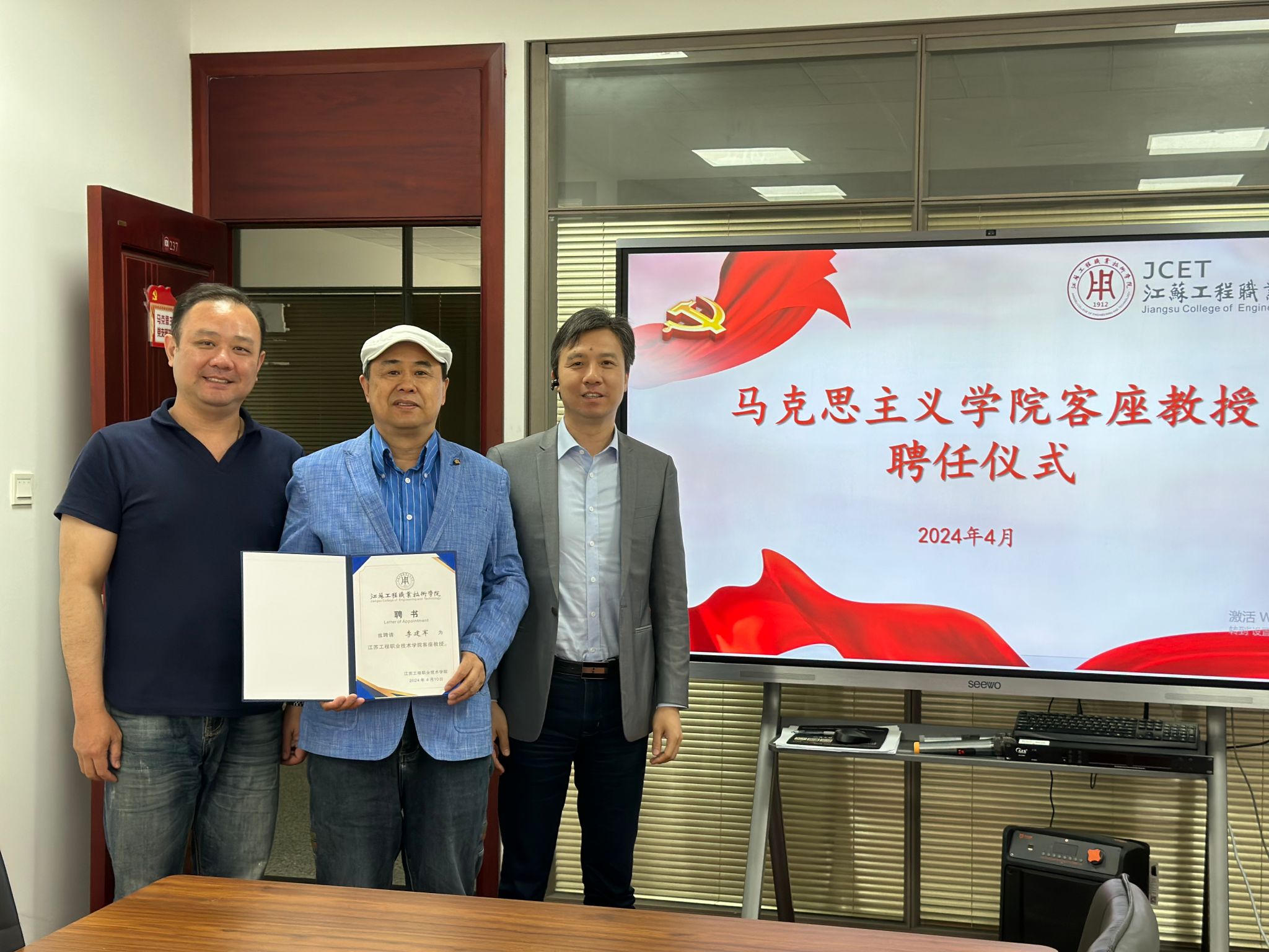 4月24日上午,南通企业文化研究会会长李建军莅临我校马克思主义学院参加客座教授受聘仪式。马克思主义学院党总支书记钱晋,副院长朱建热情接待了李建军会长,并向他颁发了客座教授聘书。