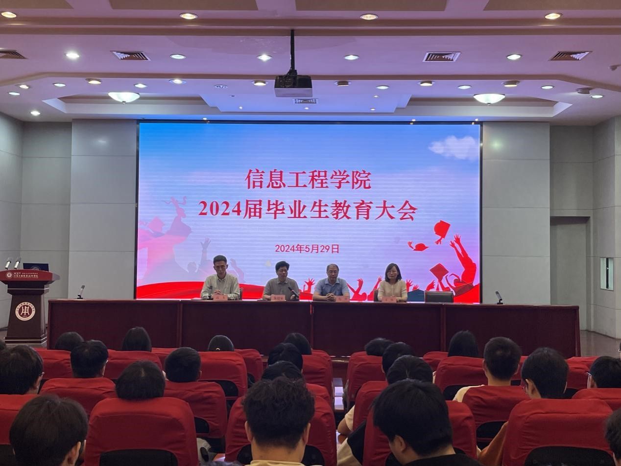 5月29日,信息工程学院在致知楼三楼报告厅召开2024届毕业生教育大会,信息工程学院党总支书记朱建泉、副院长范君、党总支副书记高飞、副院长王欣出席会议,学院辅导员、班主任及21级在校毕业生参加了会议,会议由高飞主持。
