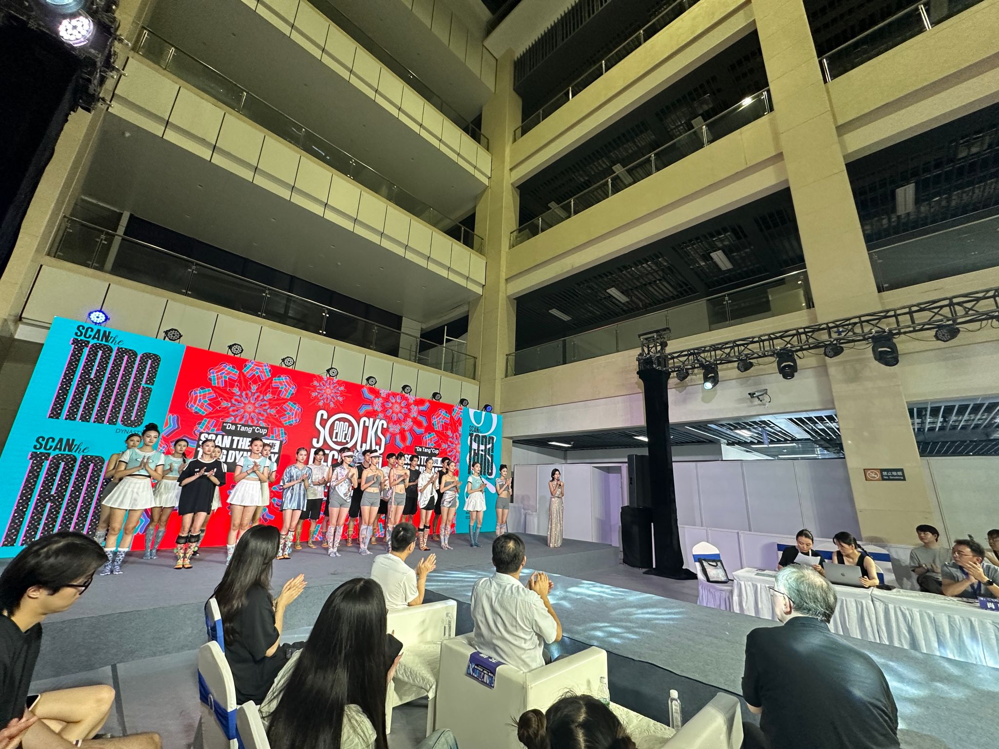 本届比赛自今年6月启动报名,来自世界各地的上千件设计作品角逐进入现场决赛资格,通过初赛评选,共35件作品进入9月8日晚总决赛现场。我校三位同学利用暑假2个月时间完成了从画稿设计到实物打样,再到周边产品搭配。决赛现场,模特们穿着风格各异的设计作品走上舞台,向现场的评委和观众进行全方位展示。评委从袜子的创新性、实用性、美观性等时尚创意角度进行评价,最终决出2项金奖、3项银奖、6项铜奖等。