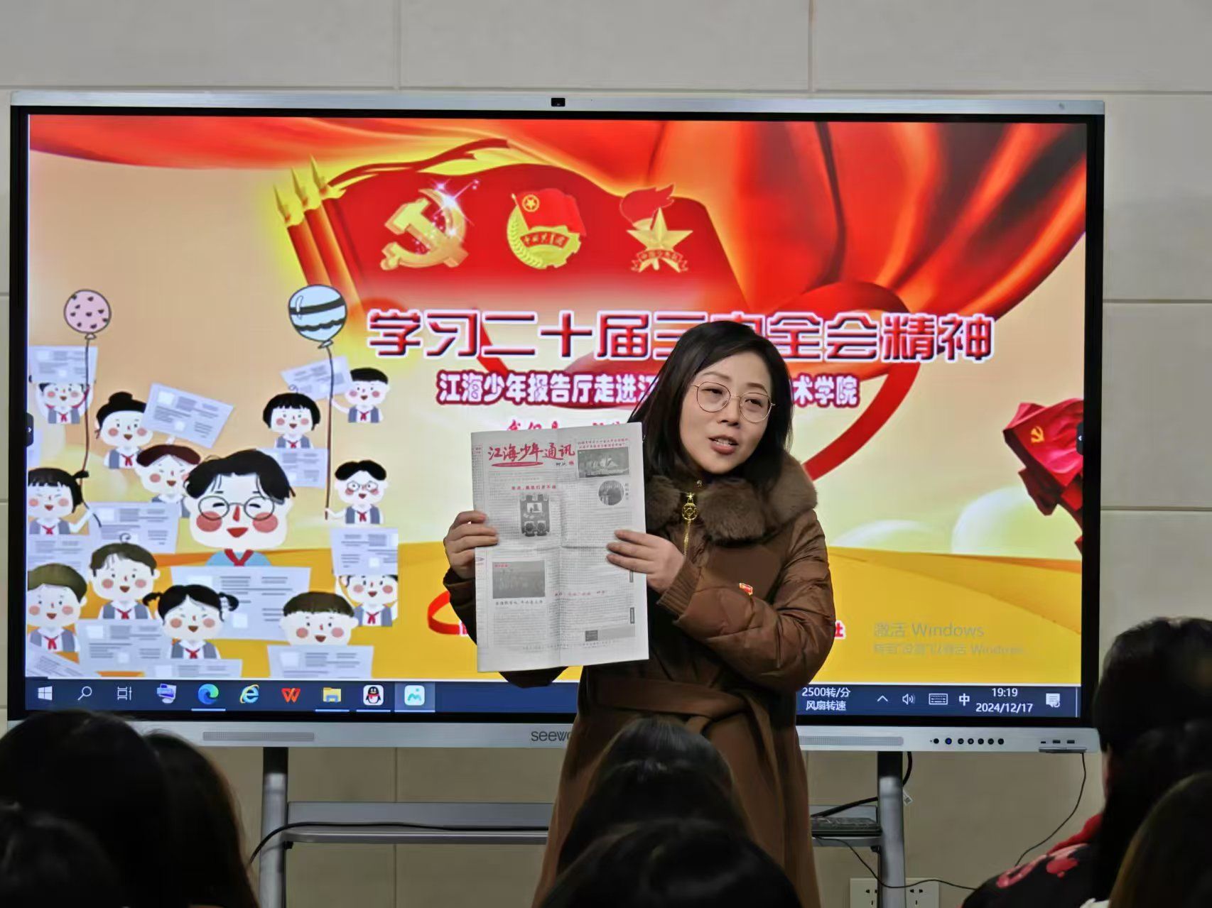 12月17日晚,艺术设计学院邀请江海少年通讯社•江海少年报告厅的少先队员走进我校,开展学习党的二十届三中全会精神教育宣讲,大中小学生共同上了一节特殊的思政课。体验式教育专家、江苏少年儿童研究会社会教育专业委员会副主任朱涌,艺术设计学院党总支书记彭曼,学院团总支书记张晓霞、副书记王皓澄及100余名学生党员先锋工作站成员和新团员参加了活动。宣讲活动由江海少年通讯社陆以蒙担任主持人。