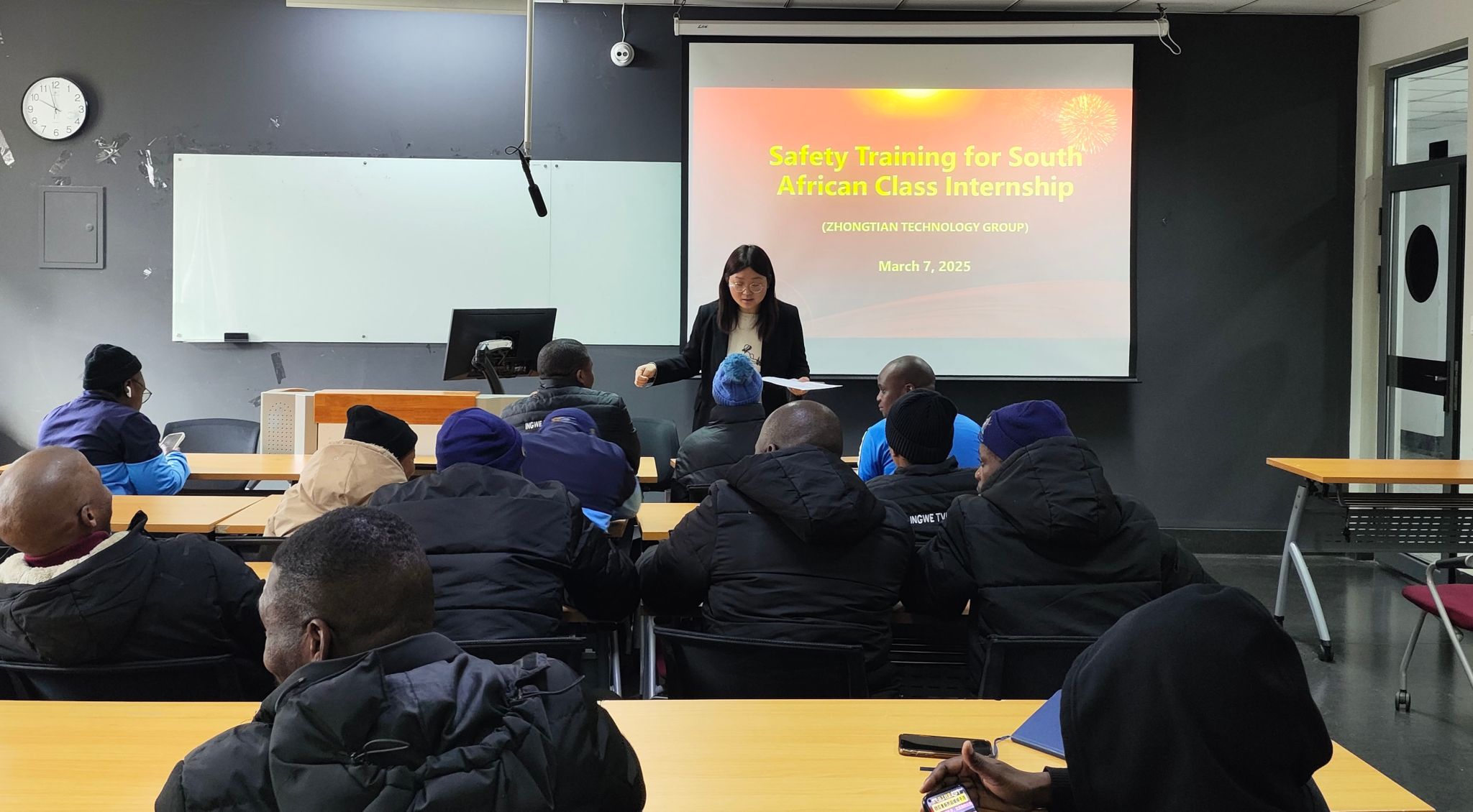 培训会上,蔡彩虹与安东明从企业文化、实习注意事项、培训方案三方面展开讲解,重点强调了安全生产规范与跨文化适应要求,表示中天科技集团将“安全第一”理念贯穿实习全程,通过标准化操作培训、定期座谈会及生活保障措施,为留学生提供安全、高效的学习环境。南非留学生代表表示,这次实习是理论与实践相结合的重要机会,他们将以严谨的态度学习技术,尊重中国文化,为中非友谊添砖加瓦。梁博强调,顶岗实习是职业发展的关键一步,希望同学们珍惜机会,将所学转化为未来职业发展的核心竞争力。