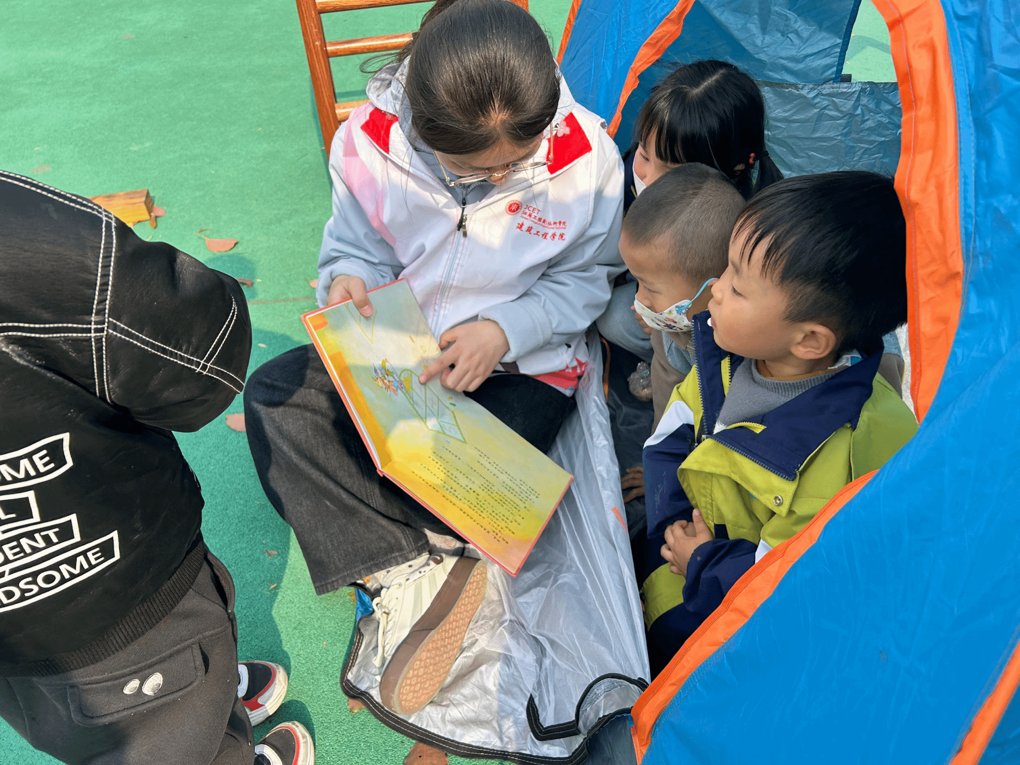 当天,故事组志愿者精心设计《好饿的毛毛虫》立体书剧场,通过道具制作、情景模拟等方式激发小班幼儿的阅读兴趣;手工组志愿者运用专业技能,指导幼儿用干花、亮片装饰书签,引导小朋友们走进阅读的世界;绘画组志愿者则带领幼儿绘制 20 米长卷“我心中的图书馆”,将美学教育融入阅读实践。志愿者们寓教于乐,在轻松欢快的氛围中游戏过程中,培养了孩子们浓厚的阅读兴趣和卓越的艺术素养。活动尾声,志愿者代表与孩子们共同埋下“阅读时间胶囊”,封存活动照片与手绘心愿卡。