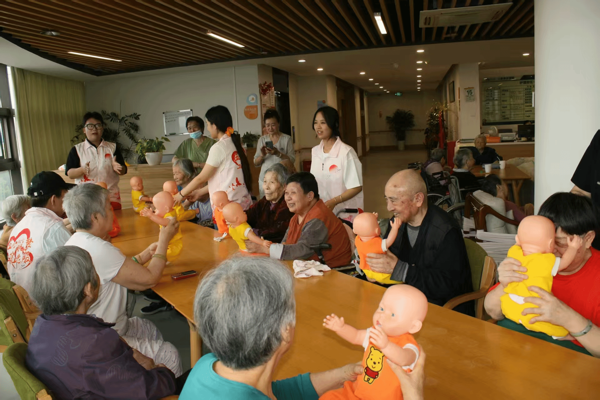 活动现场,老人们在学生的引导下,轻轻抱起“萌娃”,在温馨的互动中,时光仿佛在此刻放慢脚步,老人们的脸上洋溢着久违的柔软与笑意。对于首次尝试的“模型陪伴”这种创新形式,护理院工作人员感慨不已:“老人们平时很少接触这类互动,今天明显能感受到他们特别投入。”参加志愿服务的学生表示,通过观察老人与“萌娃”的相处细节,深刻体会到创新型养老活动的独特价值,不仅能唤醒老人内心的情感联结,也让自己对专业实践有了新认知。