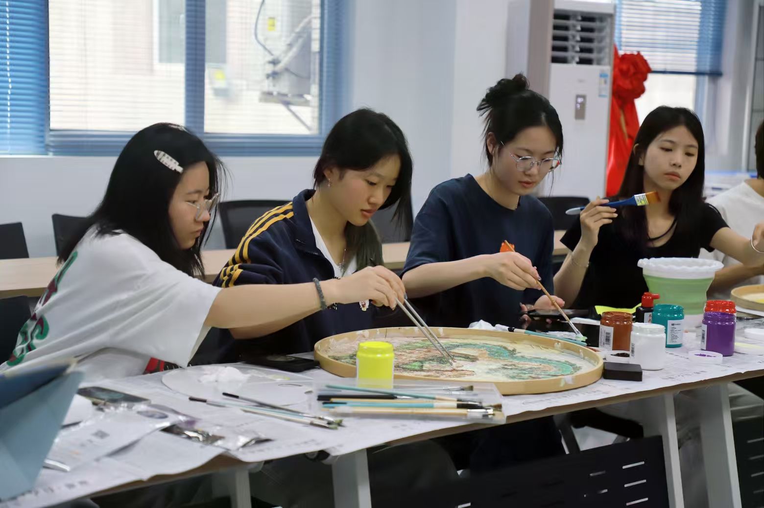 随后,同学们通过观看视频,系统学习了簸箕画的构图、色彩运用以及寓意表达等技法。自由创作与指导环节中,同学们热情高涨,分组投入到簸箕画创作中。有的同学参考传统农耕场景,以细腻笔触勾勒插秧、丰收画面,展现劳动人民的辛勤与喜悦;有的聚焦现代生态农业,绘出智慧农田、绿色乡村的蓬勃生机;还有同学独具匠心,将农耕与端午节元素巧妙融合。画面里,有金黄麦田旁村民包粽子的欢乐场景,粽叶飘香;有龙舟在水面飞驰,划船手奋力拼搏,岸边观众呐喊助威,尽显端午民俗活力,展现出传统文化与节日、农耕文化的交融之美。创作过程中,指导老师穿梭其间,为同学们提供专业建议,帮助大家不断完善作品。