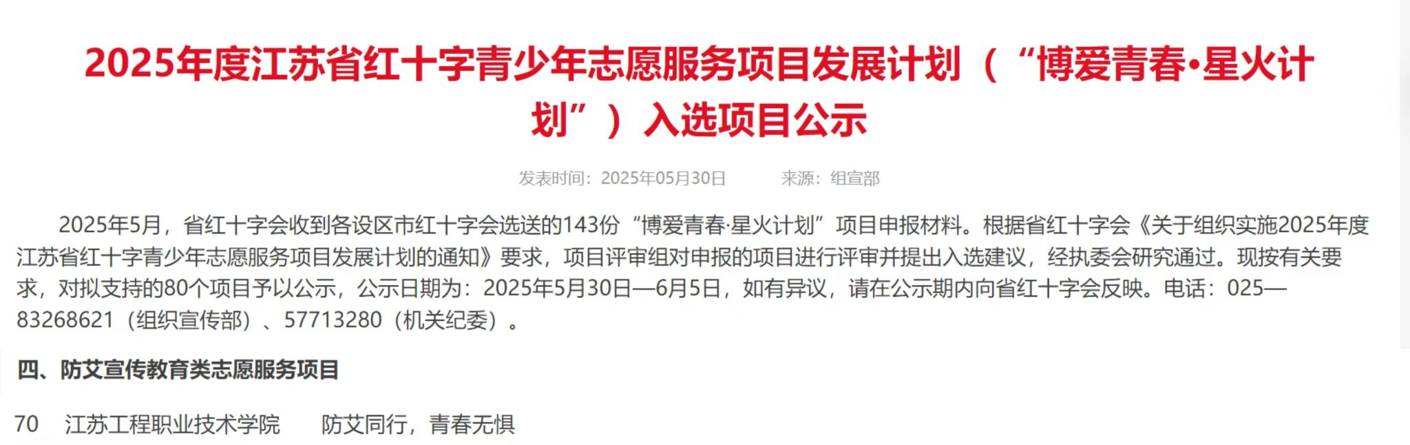 近日,我校学生红会申报的“防艾同行,青春无惧”项目成功入选2025年省“博爱青春·星火计划”第四类防艾宣传教育类志愿服务项目并获资金支持。