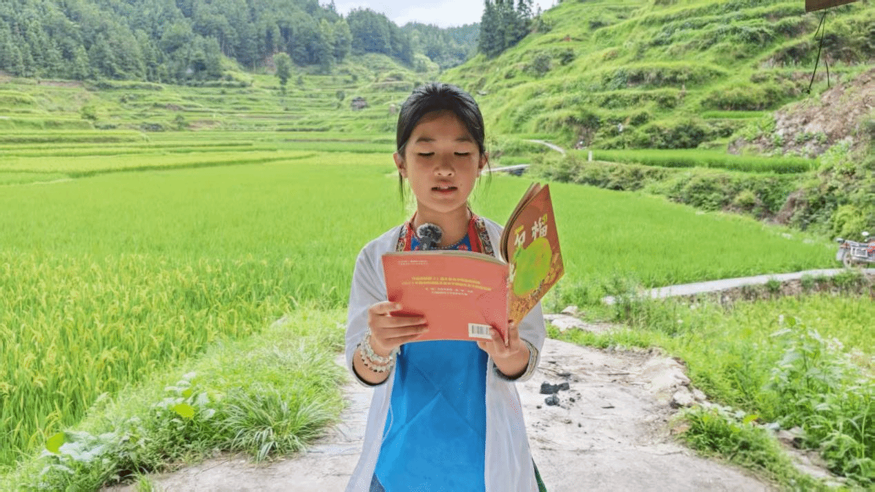 在小黄村的梯田上,实践团成员以欣欣然亲子俱乐部负责人周玉暄推荐绘本《慢石榴》开启了“梯田上的读书会”。成员们通过自主阅读、片段朗读、绘本句接力赛等形式,让孩子们在温馨互动中感受普通话的温度。侗族女孩吴芷萱捧着绘本感慨:“哥哥姐姐们陪我用普通话读故事,我觉得《慢石榴》和我们一样,成长是个漫长的过程,只要坚持就会成功。”阳光洒在梯田上,孩子们的朗朗读书声与风吹稻浪的声音交织在一起,成为最动人的语言课堂。在占里村的风雨桥中,实践团带来了侗族民间故事绘本《找金鸡》,让语言学习与文化传承深度融合。孩子们兴奋地对照绘本讲述自家银饰上的花纹、村口鼓楼的建筑特色,看到桥上的木雕花纹会主动用普通话描述:“这和绘本里鼓楼的雕花很像,都是龙和凤凰的图案!”活动最后,实践团将带来的绘本全部捐赠给当地儿童,团长隆思缘说:“普通话是乡村孩子看世界的‘望远镜’,当他们能用普通话讲好侗家故事,便是推普助振兴的意义所在。”
