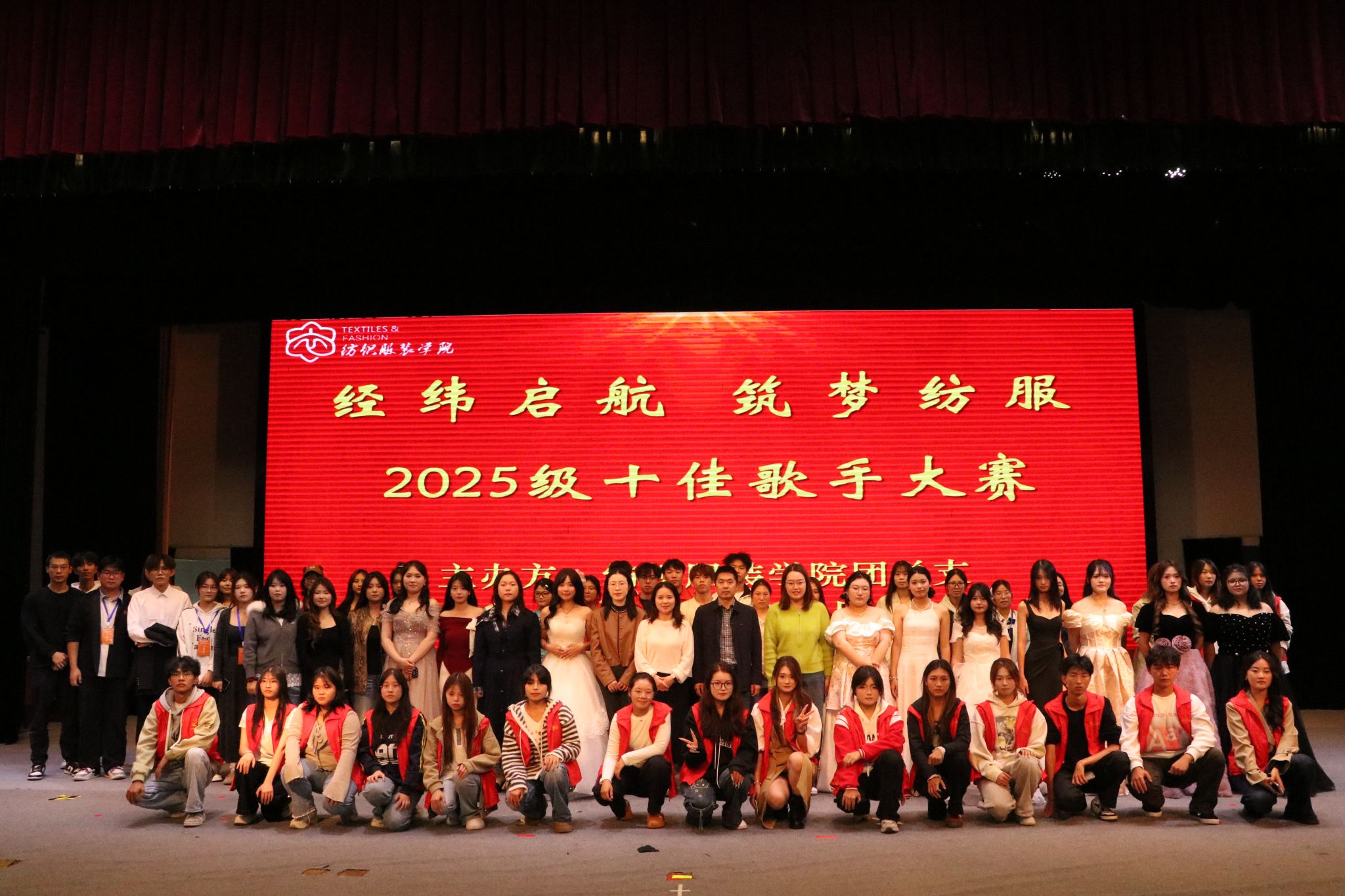 10月19日晚,由纺织服装学院主办的“经纬启航,筑梦纺服”2025级十佳歌手大赛在崇川大礼堂举行。纺织服装学院党总支副书记刘桂阳、辅导员周星星、黄新颖、沈慧、孟诗凯、校2024级十佳歌手亚军夏默妍担任评委,近八百名新生共同观摩了此次比赛。