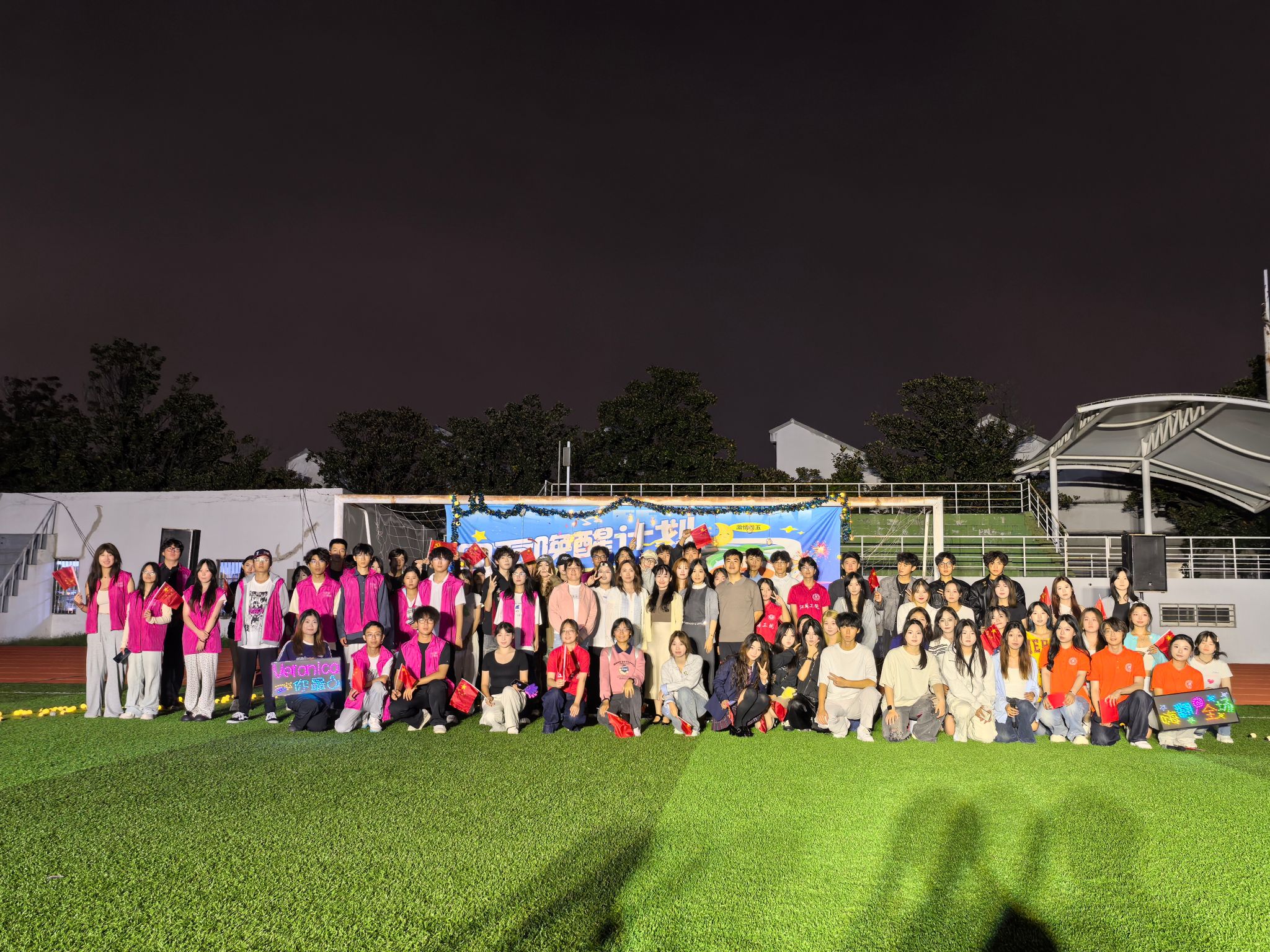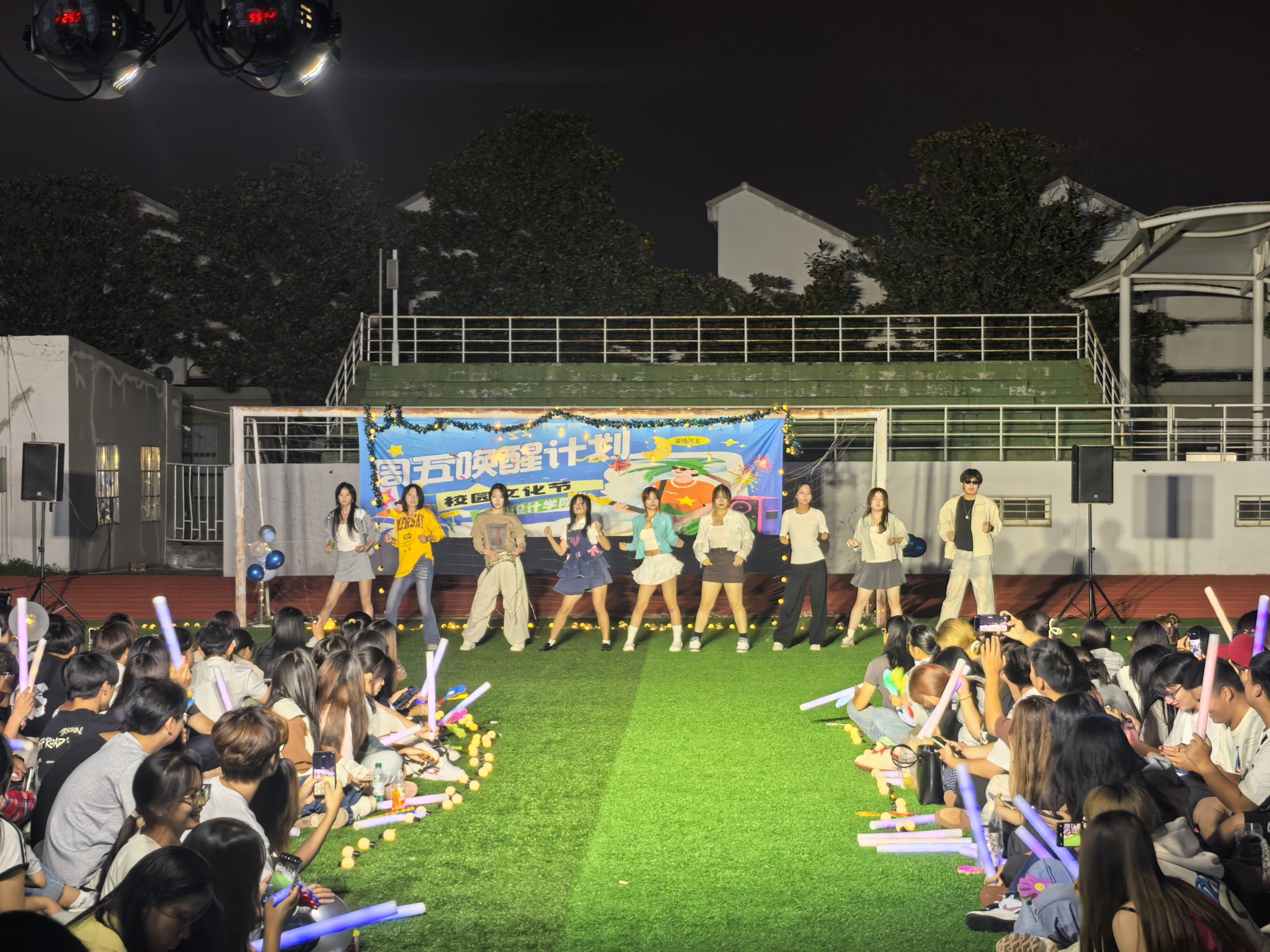 当日夕阳尚未完全褪去,绿茵场已化作欢乐的海洋。师生们早早聚集,静候这场艺术之约,悠扬旋律缓缓流淌。活动伊始,一段活力四射的开场舞《爱的主打歌》,瞬间点燃现场氛围。晚风渐浓,灯光愈发绚烂,十余首风格各异的歌曲轮番登场,为现场带来沉浸式视听体验,从浅吟低唱、满含柔情的吉他弹唱,到节奏强劲、点燃热血的摇滚乐曲,每一首音乐都引发现场共鸣。跳动的音符在夜空里穿梭,阵阵掌声与欢呼声交织,将青春活力洒满绿茵场。