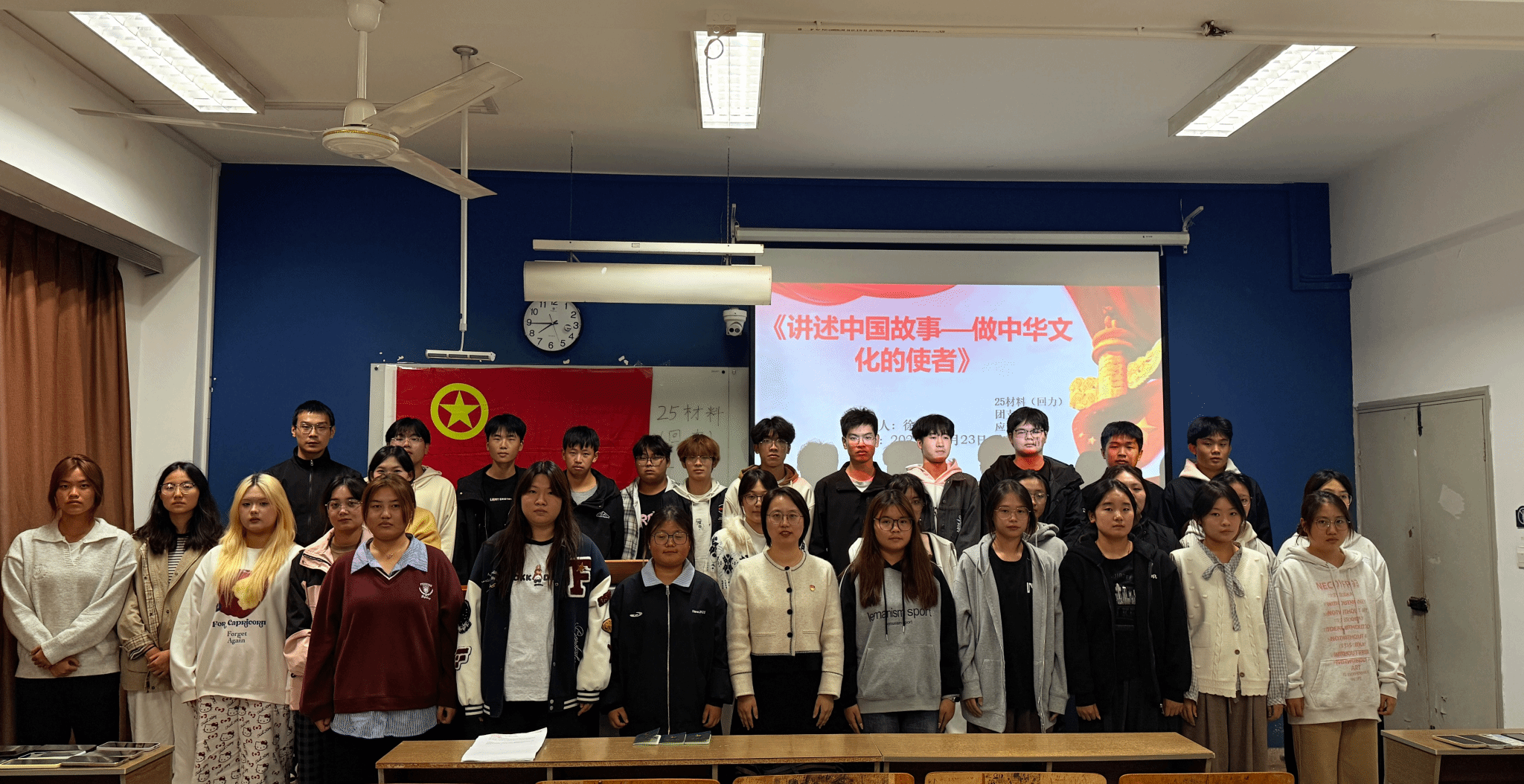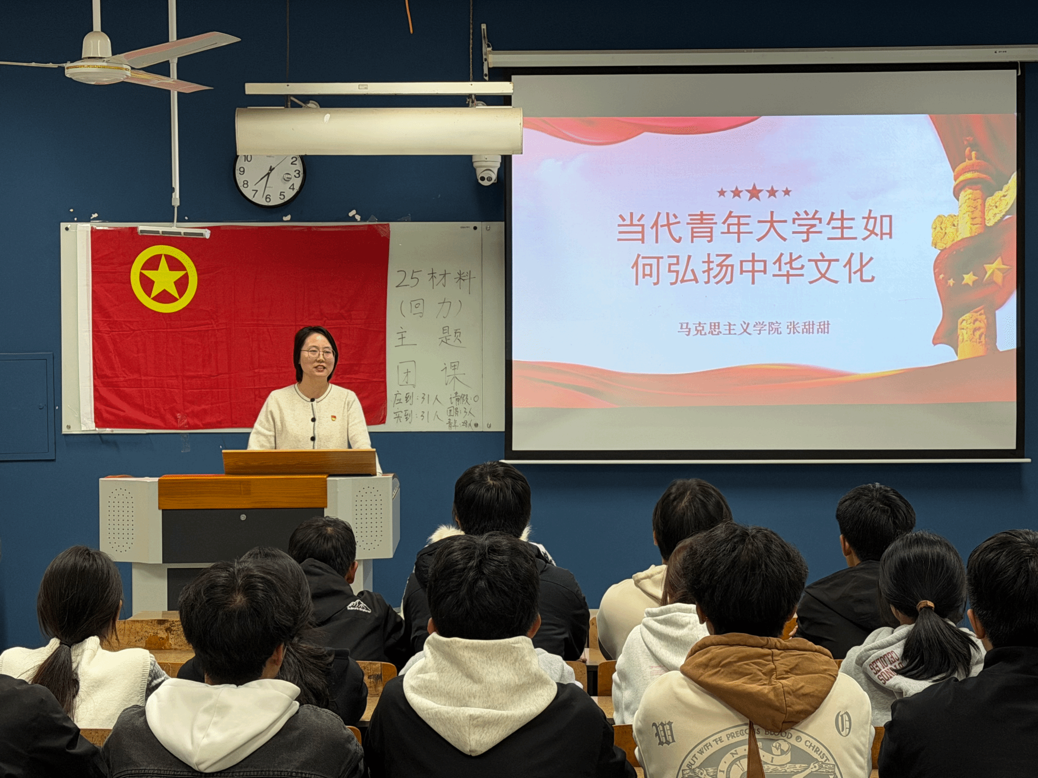 本次团课以“讲述中国故事,做中华文化的使者”为主题,围绕新时代青年如何讲好中国故事进行组织开展。在团课的开展过程中,张甜甜从“为何弘扬”与“如何弘扬”两个层面,为同学们阐述了当代青年大学生肩负的文化使命。她指出,青年不仅要将中华优秀文化内化于心,更要外化于行,用世界听得懂的语言和方式展现真实、立体、全面的中国。孟诗凯围绕团课的意义和目的向同学们强调,主题团课是加强青年学生思想政治引领、筑牢理想信念根基的重要阵地,他希望同学们能以此次团课为新的起点,持续深化理论学习,积极参与实践锻炼,将个人成长融入国家发展和民族复兴的伟大征程之中。