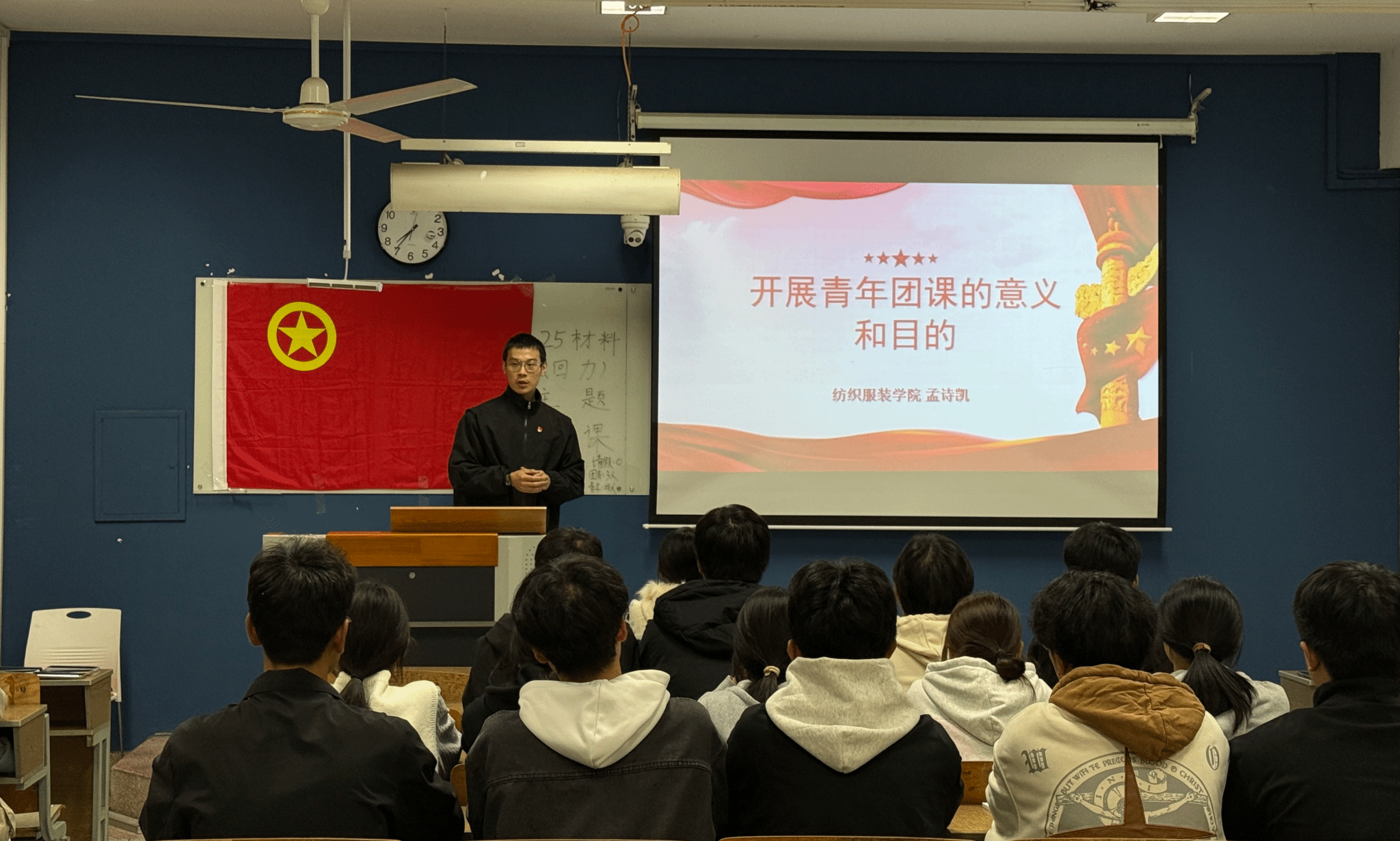 10月23日晚,25材料(回力)班团课在崇謇楼303召开,马克思主义学院专业教师张甜甜与纺织服装学院团总支副书记、专职辅导员孟诗凯旁听并作指导。