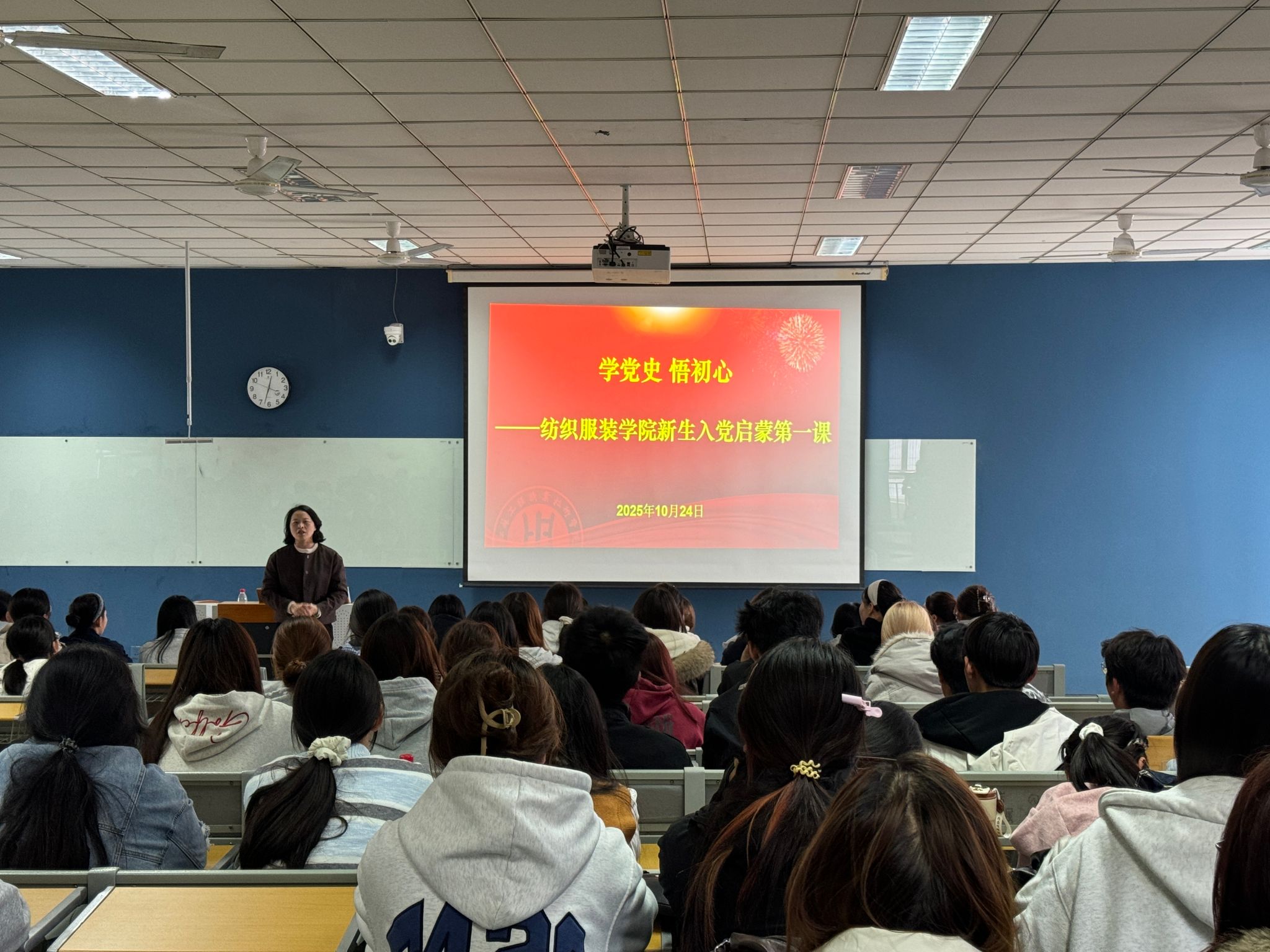 10月24日,纺织服装学院党总支在致知楼220组织开展“学党史 悟初心”新生入党启蒙教育活动。学院党总支书记夏爱萍,教育部“双带头人”教师党支部书记工作室负责人、纺织党支部书记隋全侠及学院25级新生团员参加了本次活动。