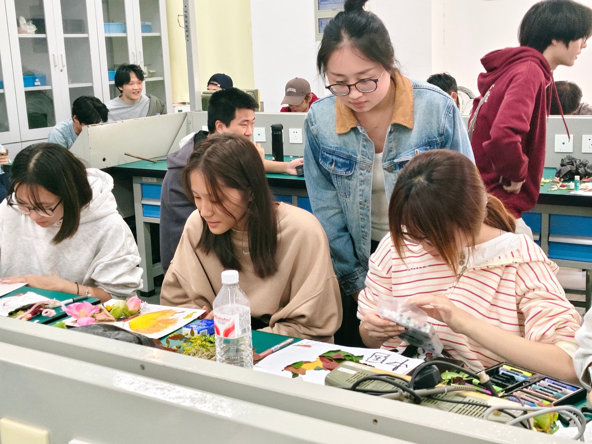 讲座的第二部分,一场别开生面的“秋叶贴画”创意实践活动热烈展开。同学们利用课余时间在校园里收集的形态各异、色彩斑斓的落叶,作为创作的主要材料。在李文欣和辅导员方璐的指导下,大家充分发挥想象力与创造力,将一片片平凡的落叶,精心拼贴成一幅幅充满巧思的艺术作品。活动现场气氛活跃,同学们热情高涨。同学们以落叶拼出富有创意的图案。原本萧瑟的秋叶,在同学们的巧手装扮下,被赋予了新的生命与内涵,成为劳动之美、创造之美的生动注脚。