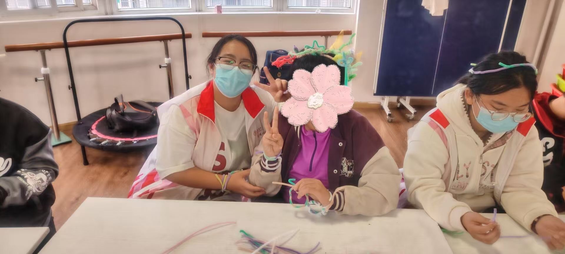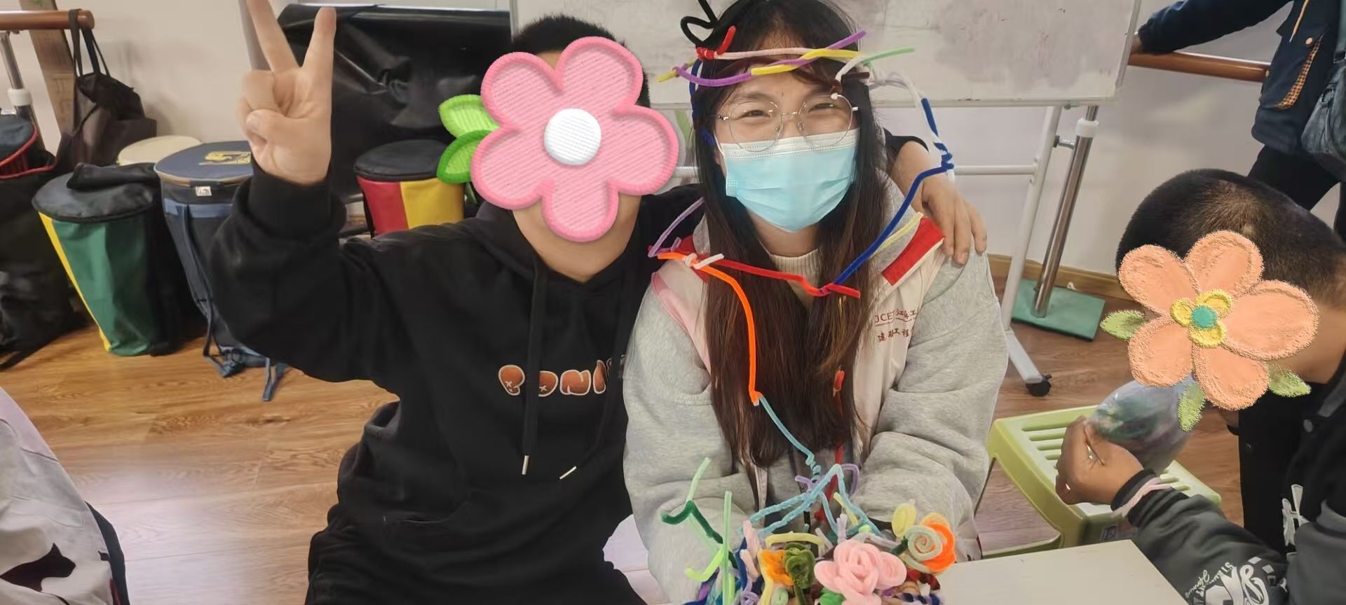 活动现场暖意融融,志愿者与“小蜗牛”们以1对1、1对2的结对模式开启亲密互动。扭扭棒手工环节里,志愿者手把手演示制作技巧,用温柔鼓励引导孩子们发挥创意,一朵朵扭扭棒花朵、一个个可爱小动物在孩子们手中诞生,虽显稚嫩却满是专注与想象,志愿者及时的赞美更是让现场绽放出孩子们灿烂的笑容。心理团辅环节趣味十足,“小手拍拍乐”“优点轰炸”等游戏快速拉近距离,“情绪小火车”“彩纸拼贴心情画”活动中,孩子们借助积木、彩纸尽情表达内心情绪,现场心理老师同步开展专业疏导。活动间隙,学校心理中心老师还为志愿者开展沟通技巧与情绪安抚培训,进一步提升志愿服务专业性。