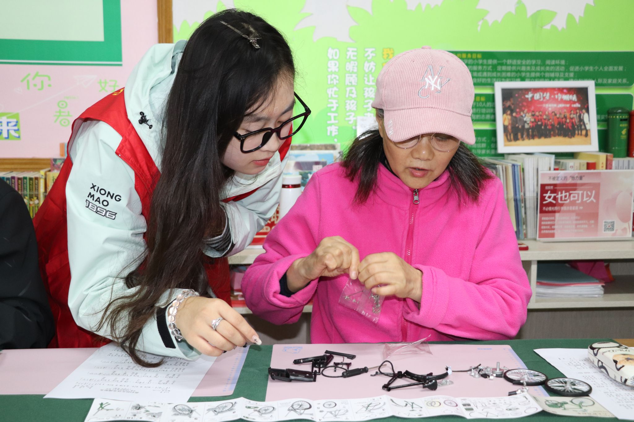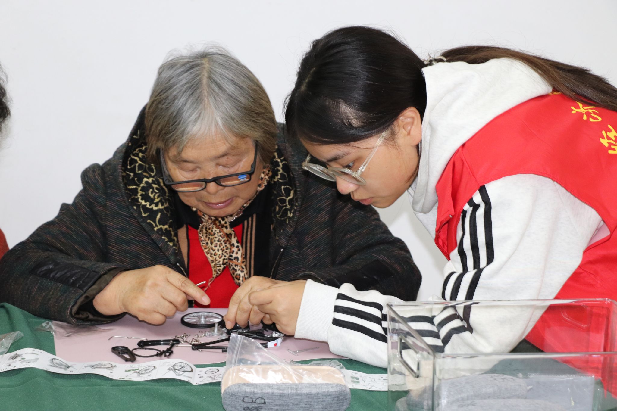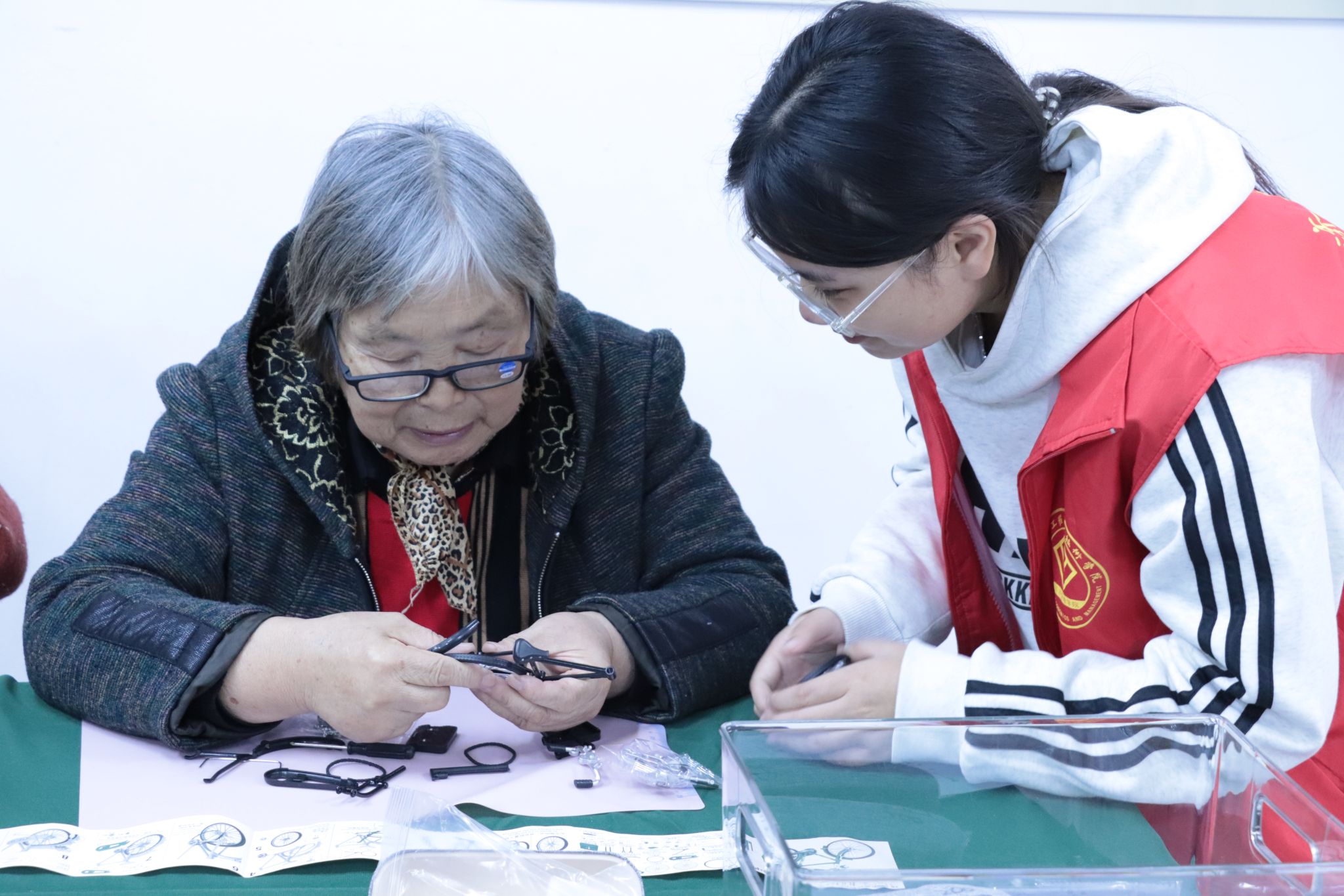 手工组装环节正式启动,大学生志愿者们主动与劳模结对,一人一组耐心服务:他们先拆开材料包,把零件按类别摆好,再用通俗的语言讲解组装要点。当最后一个零件固定好,一辆辆小巧精致的二八大杠模型完整呈现时,劳模们和志愿者们都露出了满满的成就感,不少人还拿着模型拍照留念。