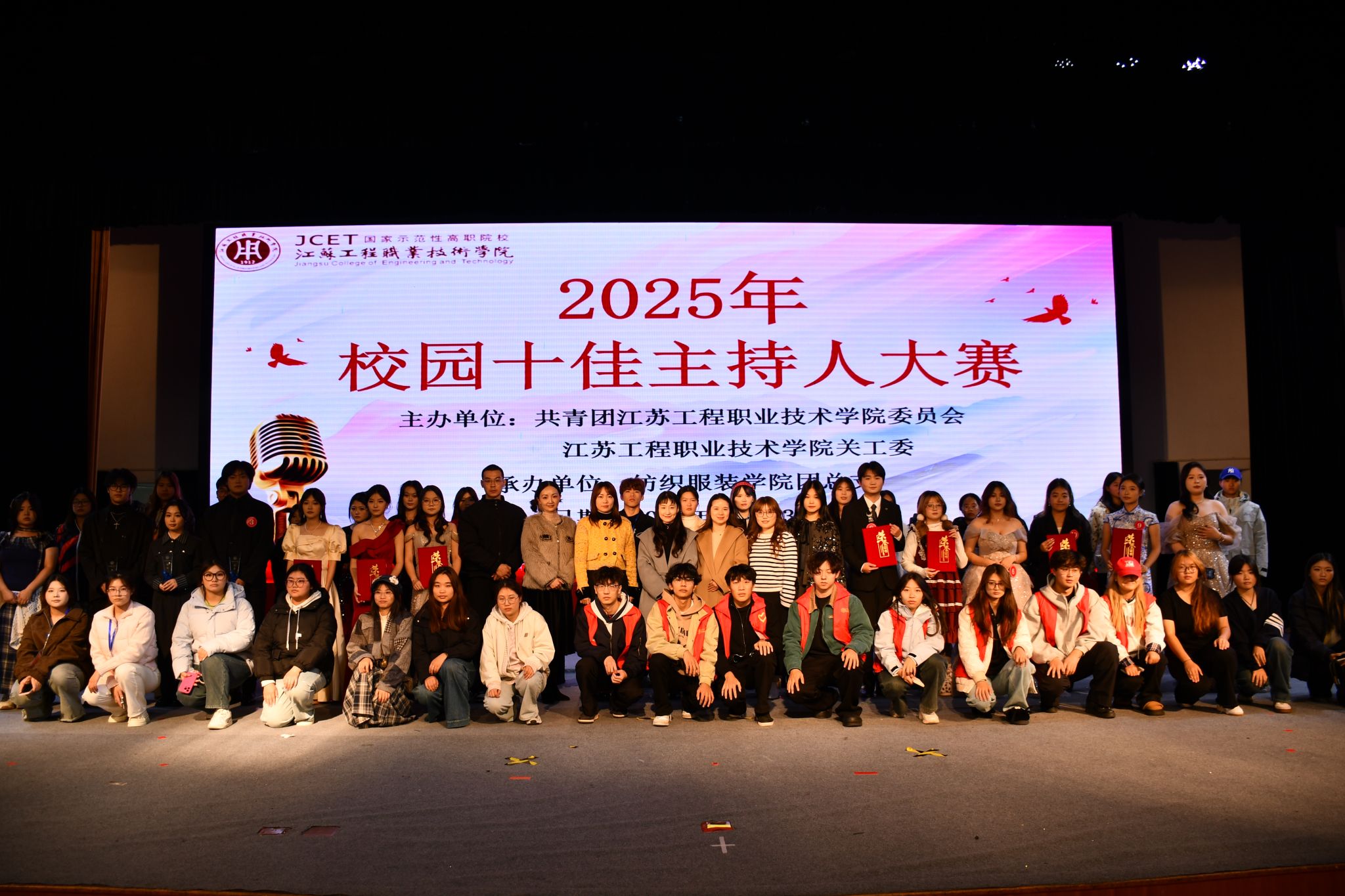 11月23日晚,由校团委、校关工委主办,纺织服装学院团总支承办的“说出精彩,成就未来”2025年校园十佳主持人大赛在崇川校区大礼堂举行。信息工程学院党总支书记沈雯、校团委副书记张禧嘉、学工部副部长张悦、基础教学部专业教师夏蕾、信息工程学院团总支副书记夏晶晶担任评委。纺织服装学院党总支书记宁尚洁、党总支副书记周星星和学生代表近600人参加了活动。