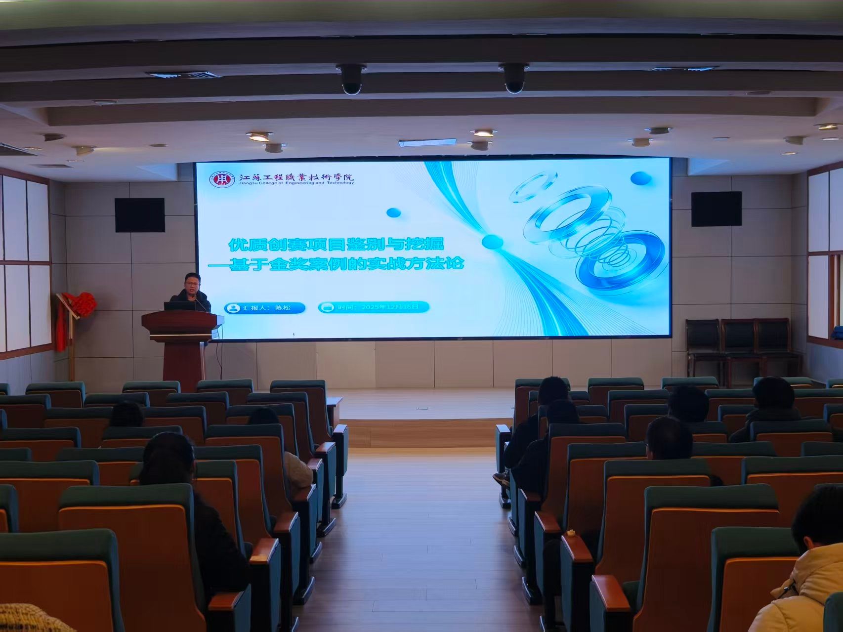 为进一步提升备赛质量和水平,会议特邀我校2025年荣获国家级金奖项目的指导老师——陈松博士进行经验分享。他结合自身指导团队夺金的实战经历,从项目遴选、团队构建、长期培育、关键突破等方面分享了宝贵的备赛策略,并针对金奖项目PPT的设计逻辑、亮点提炼与现场呈现技巧进行了深入剖析。他的分享内容详实、案例生动,为计划参与2026年大赛的师生提供了极具价值的参考。