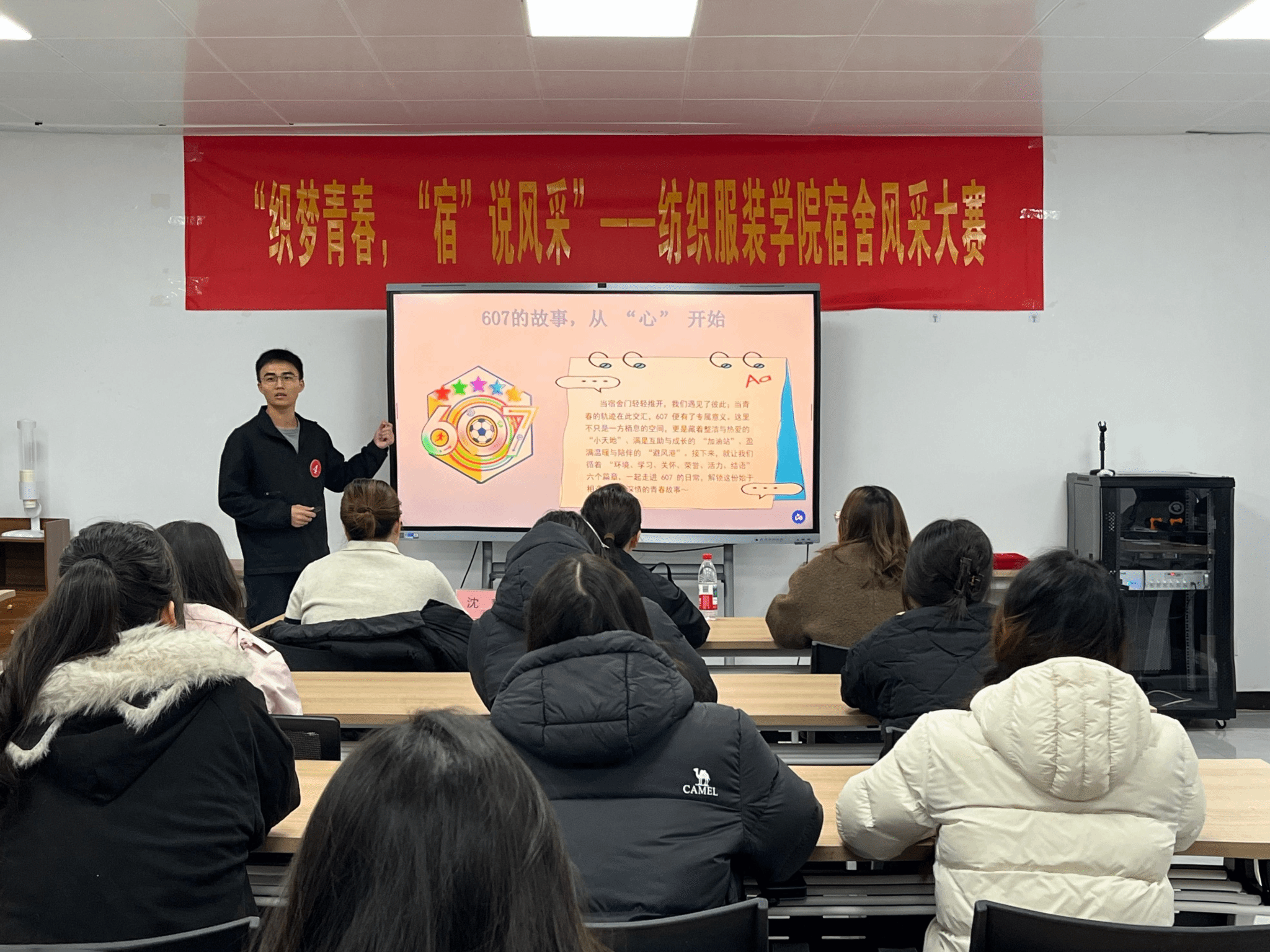 经过前期选拔,共有8间优秀宿舍脱颖而出,入围本次决赛。比赛现场,各宿舍代表依次上台,通过精心准备的PPT与个人讲述,全方位展示了各自宿舍的独特风貌。内容涵盖舍友个性介绍、集体生活习惯、多元兴趣爱好、常态化卫生维护以及牢固的安全意识等多个方面。一个个生动有趣的宿舍故事、一张张温馨友爱的合影、一份份共同制定的宿舍公约,不仅展现了纺服学子们整洁有序的生活环境,更体现了他们团结互助、共同成长的真挚情谊与积极向上的精神面貌。最终内9-607宿舍获得一等奖,内2-405-1、外8-330、内5-414等三间宿舍获得二等奖,内2-204-1、内5-601、内2-501-2、内2-103-2获得三等奖。