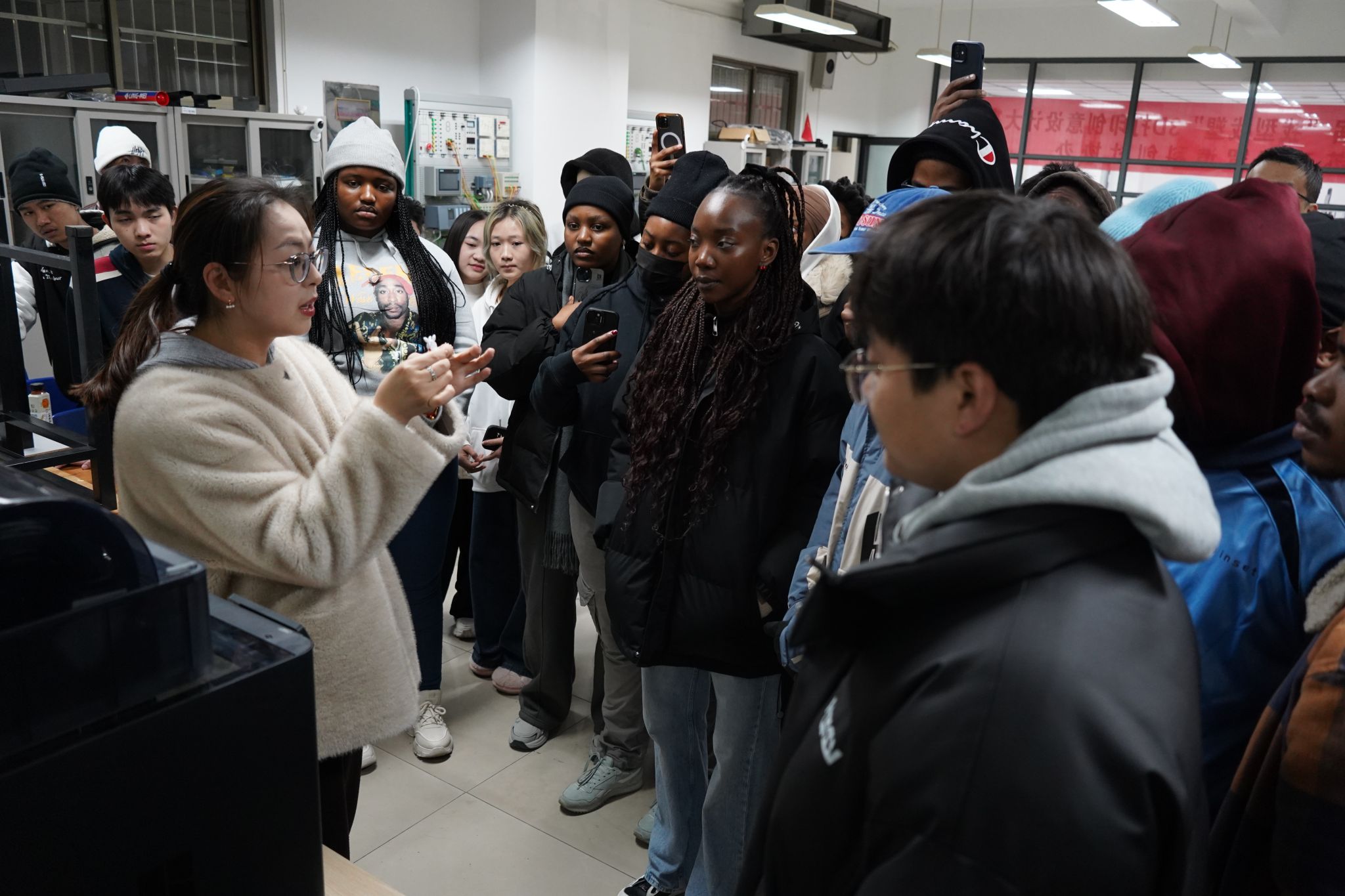 1月30日下午,学院党总支书记白林、院长胡志刚、党总支副书记朱平、副院长毕书博、团总支副书记保钰及辅导员朱晨旭与留学生一起走进崇川校区智能制造实训室。依托学院“新智领航”辅导员工作室“博士有约”沙龙,李博士为留学生们讲解并演示了智能制造设备的前沿应用,同学们踊跃观摩并亲手体验了3D打印技术。