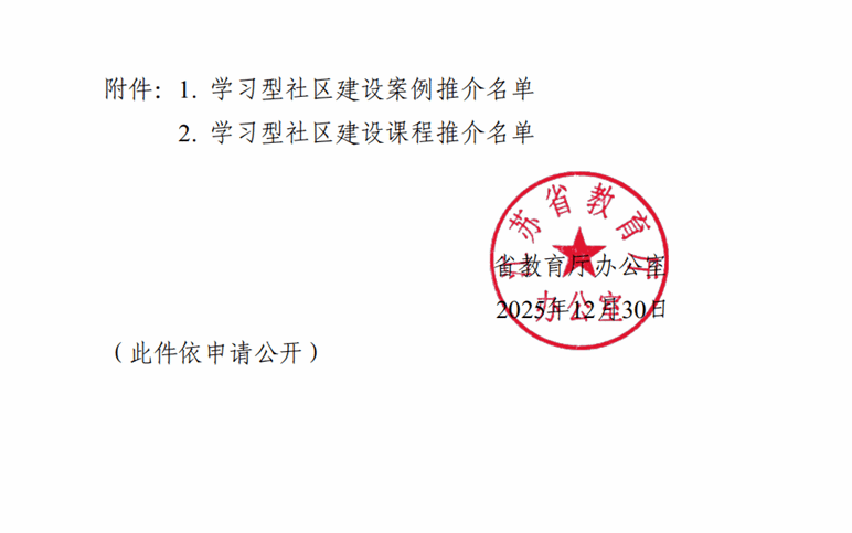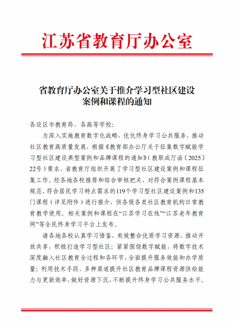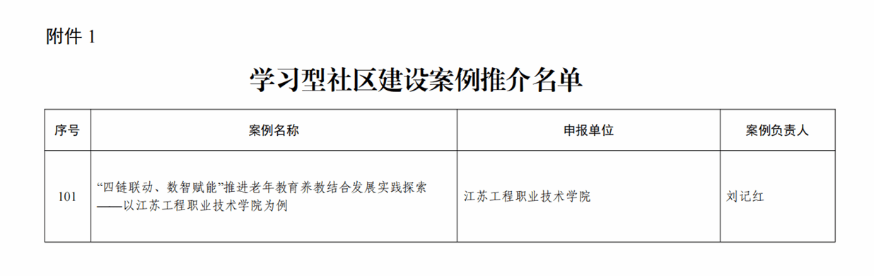 近日,江苏省教育厅办公室发布《关于推介学习型社区建设案例和课程的通知》,公布学习型社区建设案例和课程推介名单。经济管理学院刘记红教授主持的《“四链联动、数智赋能”推进老年教育养教结合发展实践探索——以江苏工程职业技术学院为例》成功入选学习型社区建设案例推介名单。