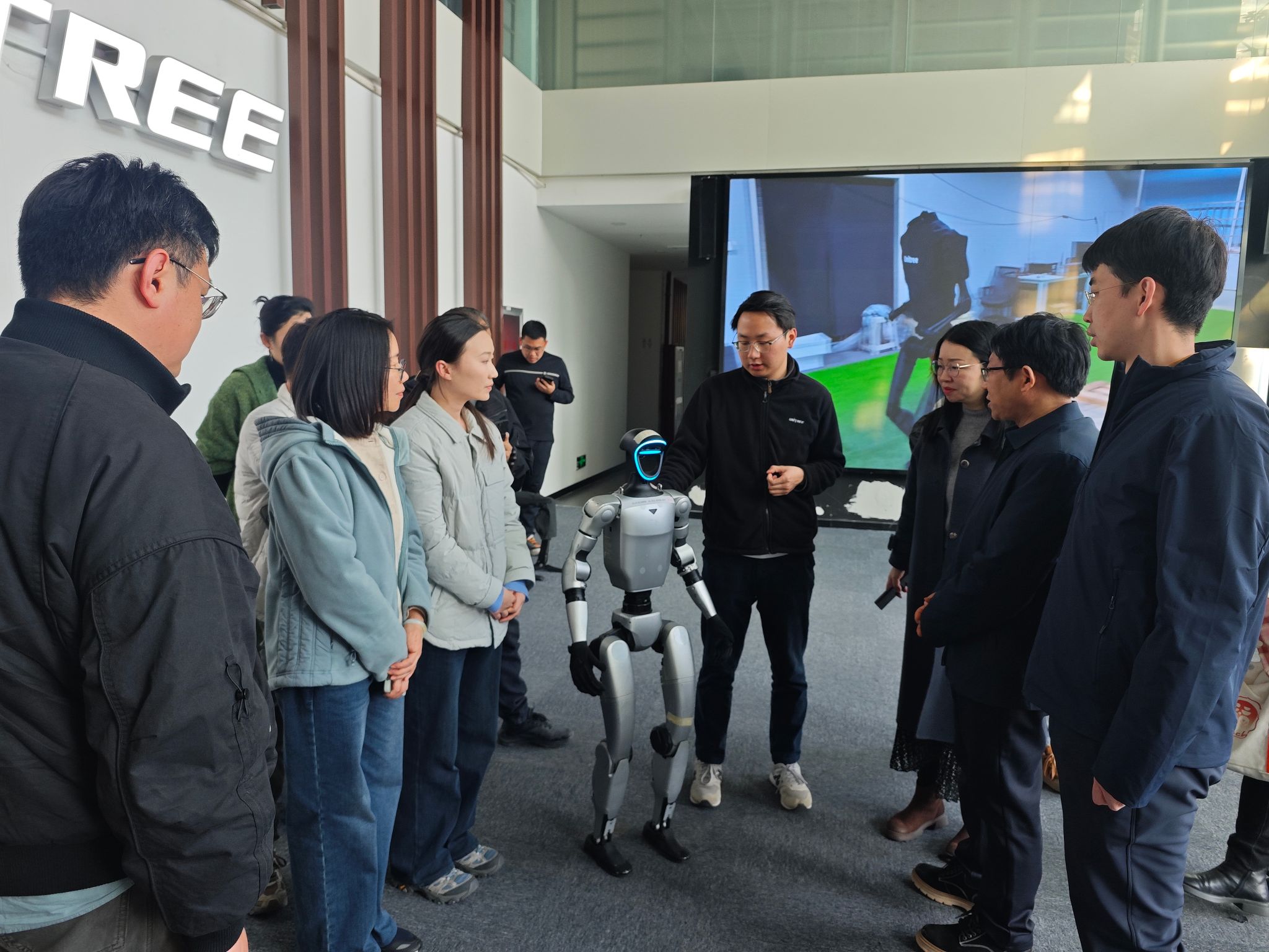 考察组首先赴宇树科技股份有限公司实地考察。该企业是国家级专精特新“小巨人”、全球足式机器人领军企业,也是国内少数实现核心部件全栈自研、规模化量产与商业化落地的仿生机器人企业,四足机器人全球市占率稳居前列,产品多次亮相央视春晚、冬奥会等顶级舞台。考察组在企业相关负责人指引下,实地了解企业发展历程、规划及核心业务,重点观摩企业在电机、减速器等核心部件自研、高性能运动控制算法研发上的硬核实力,直观感受工业级机器人在复杂场景的应用成果,精准对接智能制造领域岗位标准与技术要求,双方在校企人才联合培养、产教融合育人等方面达成初步共识。