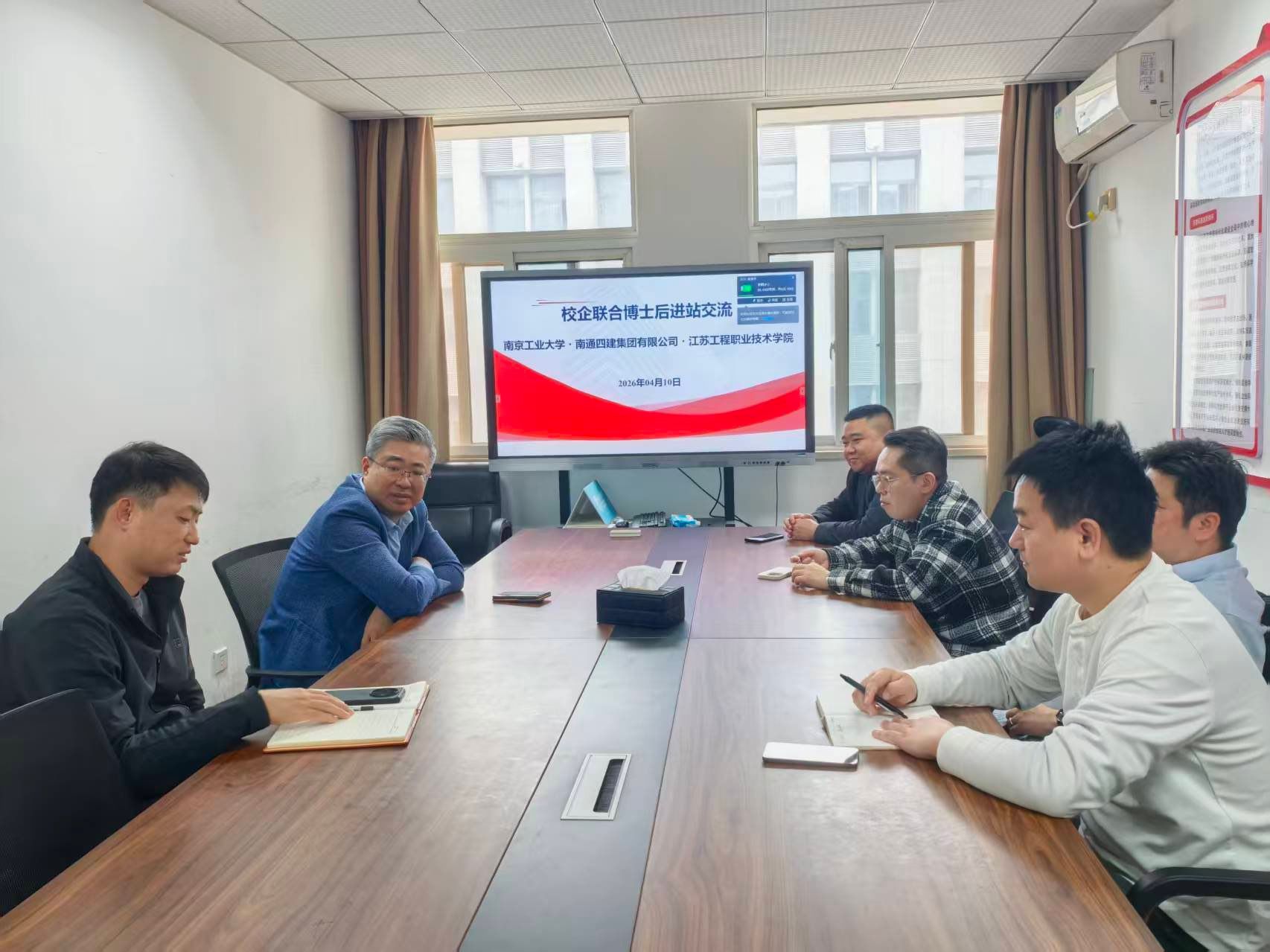 王斯海结合我校近年来科研工作布局及高层次人才培养成效,指出学校始终立足区域产业发展需求,持续加强科研平台建设,深化校企合作。依托学校博士“共引、共享、共育”政策指引,学院积极推进联合培养机制,促进青年博士科研能力和工程实践能力双提升。高路恒结合产教融合工作实际,交流了学校在校企协同育人、产学研合作方面的做法与成效,并表示将进一步发挥桥梁纽带作用,完善联合培养机制,做好资源统筹与服务保障。徐卓介绍了南通四建集团与我校前期合作情况,对双方良好的合作基础及我校博士前期在企业参与相关工作的表现给予肯定。他表示,希望以此次博士后联合培养为契机,进一步深化校企协同,推动人才互通、资源共享,促进校企共育、合作共赢。