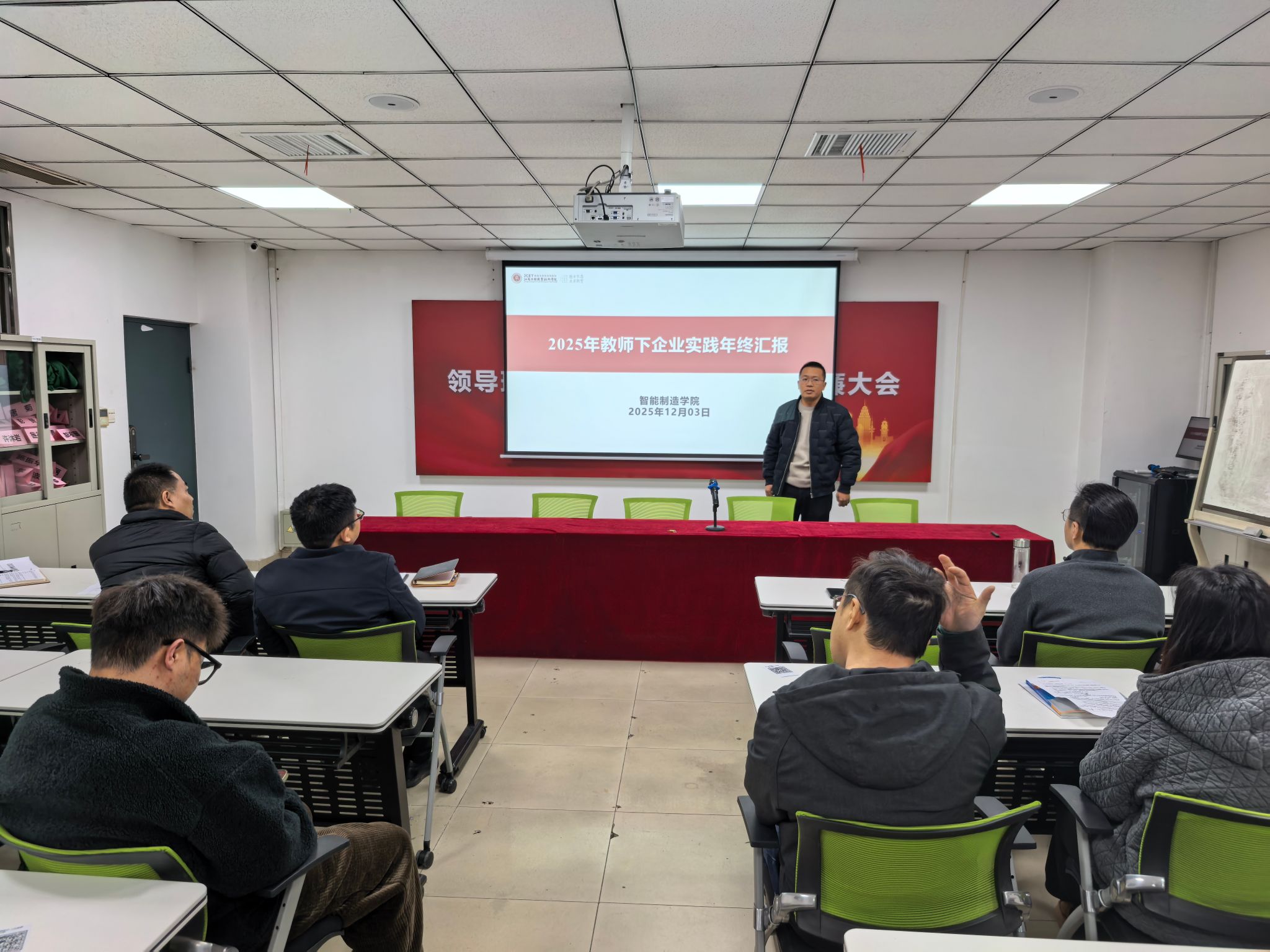 12月3日,智能制造学院组织召开了2025年度教师企业实践考核会议,对本年度参与企业实践的教师进行考评。学院领导、企业专家、各专业负责人及教师代表共同组成考核工作小组,学院院长胡志刚担任组长并主持会议。