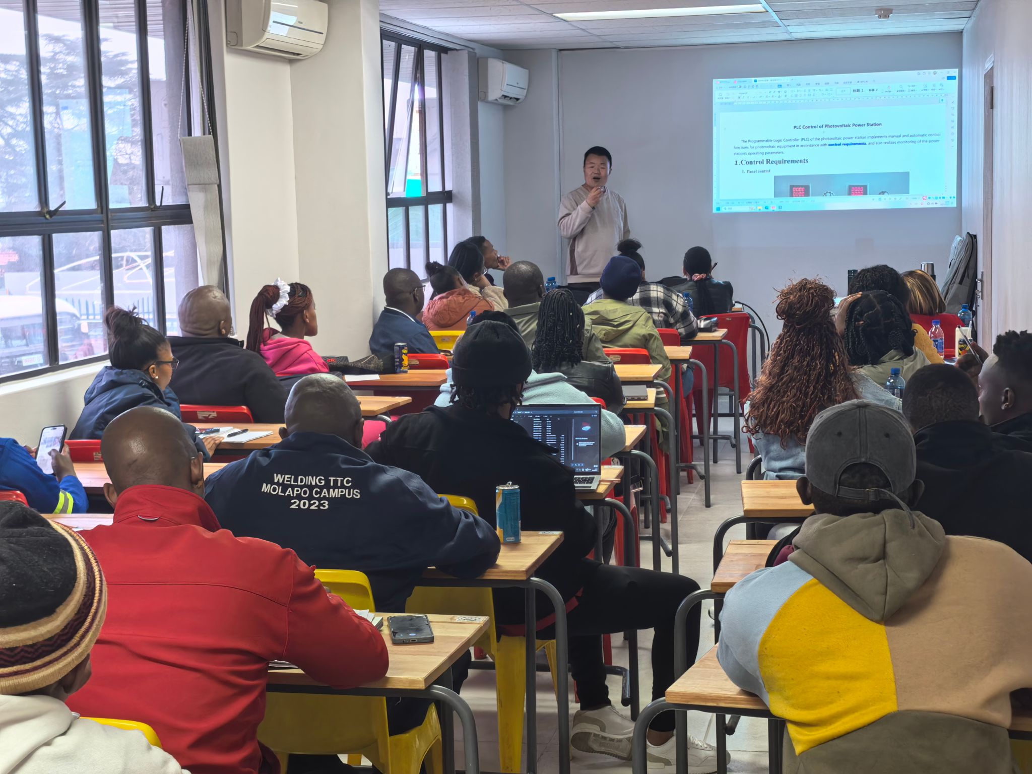 在西南豪登技术与职业教育学院,副教授李金喜结合非洲新能源发展实际,系统讲授了新能源发电技术发展趋势、实训设备功能与应用、系统运行原理等专业知识。培训注重理论与实践相结合,学员们在教师指导下完成了设备安装、调试与操作训练,课堂互动热烈,学习氛围浓厚。