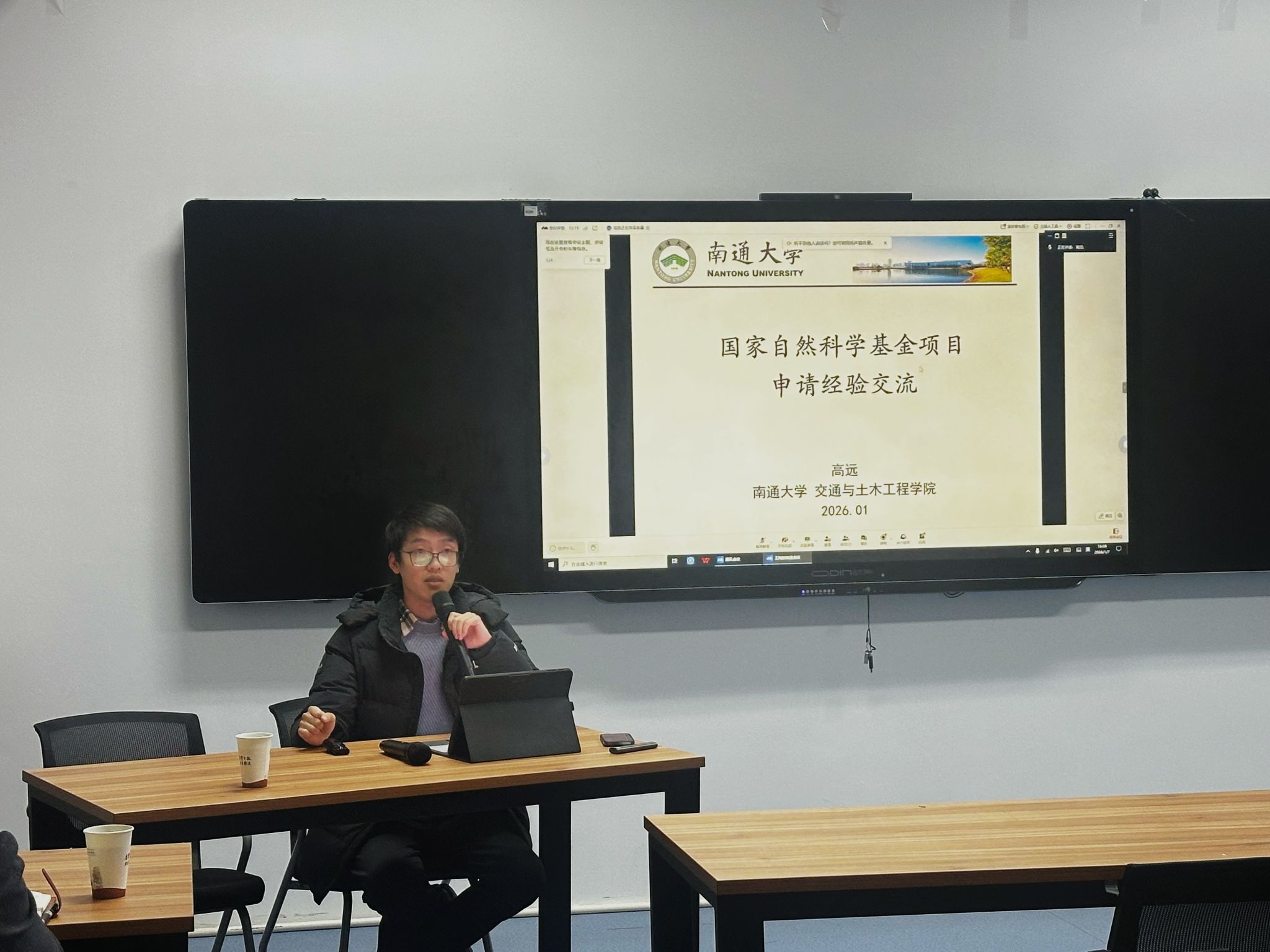 聚力科研启新程——建筑与交通工程学院举办国家自然科学基金申报动员与政策解读专题讲座 1月7日下午,建筑与交通工程学院在学院会议室举办“聚力科研启新程——国家自然科学基金申报经验与政策解读”专题活动。特邀校科研处副处长高飞、南通大学高远博士担任主讲嘉宾。院长王斯海、全体博士及教学科研并重岗教师、青年教师代表参加了本次活动,活动由副院长袁东进主持。活动伊始,袁东进阐述了本次活动的背景与重要意义,强调博士等高层次人才在推动学院科研创新、支撑学校科研平台建设中的使命,并明确了活动目标:一是深入了解国家自然科学基金的申报流程、... 2026-01-08