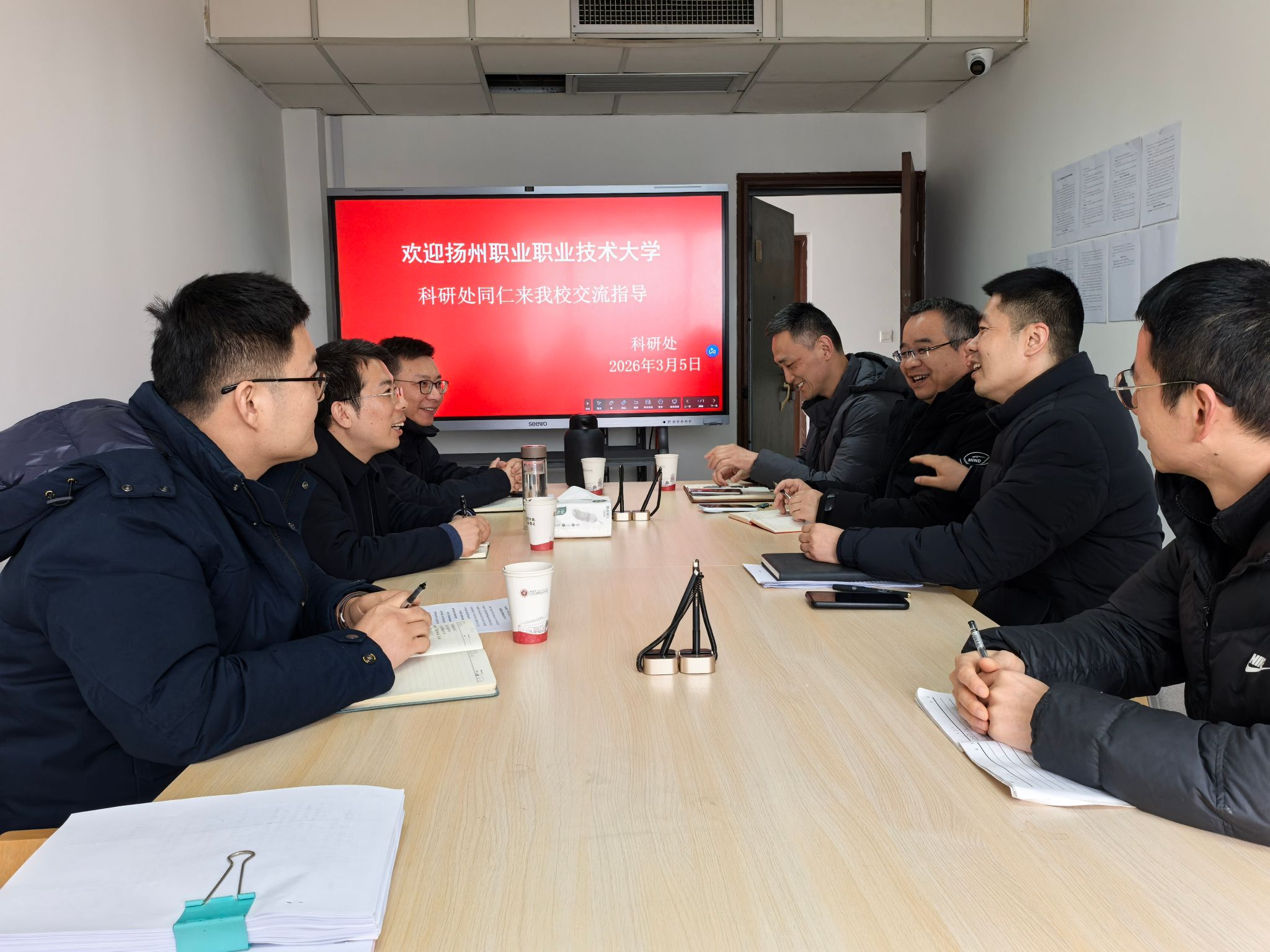 扬州职业技术大学科技产业处到我校交流 3月5日上午,扬州职业技术大学科技产业处王丹处长一行到我校交流,就职业院校科研管理、科研申报、成果转化、产教研融合等方面进行深入交流,交流会由科研处处长刘桂阳主持。刘桂阳介绍了学校的发展历程、科研处基本情况、取得的科研成果、科研人才队伍,以及在产教深度融合、校企合作、科研与社会服务等方面开展的工作与实效,并重点介绍了我校2025年获批国家自然科学基金依托平台的情况。王丹介绍了扬州职业技术大学科研处的基本情况、... 2026-03-07