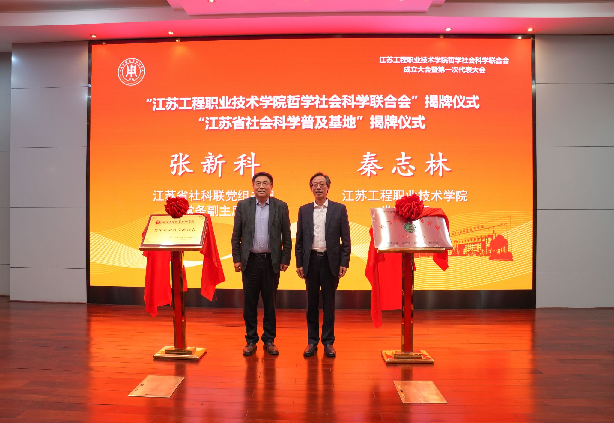 江苏省社科联党组书记、常务副主席张新科,校党委书记秦志林共同为“江苏工程职业技术学院哲学社会科学联合会”以及“江苏省社会科学普及基地”揭牌。