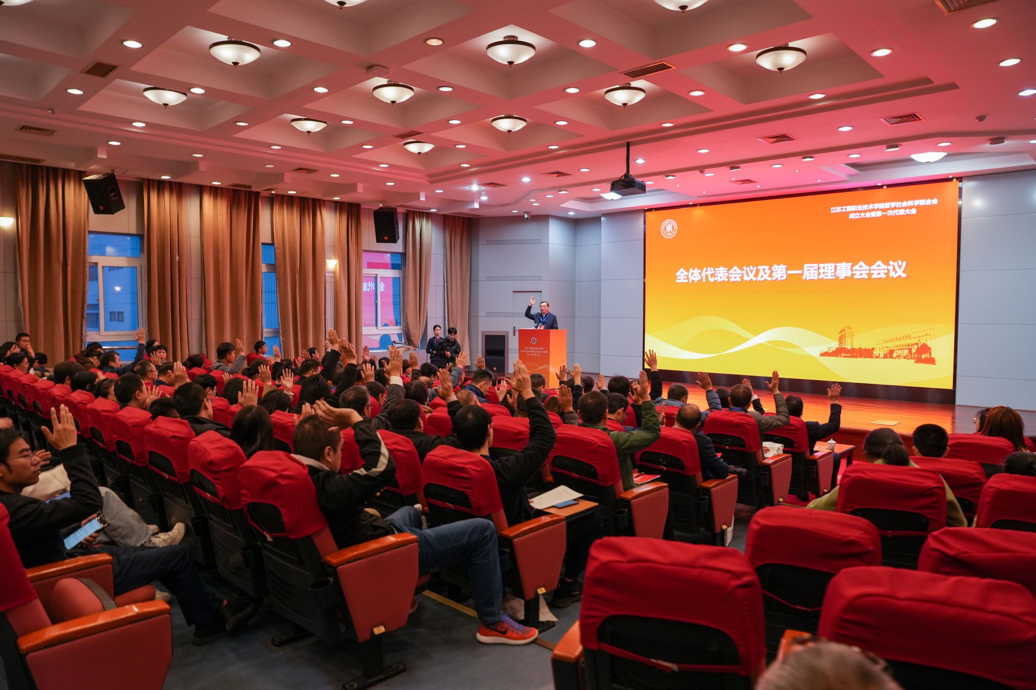 校党委委员、副校长郭江峰作了江苏工程职业技术学院哲学社会科学联合会筹备及章程起草工作报告。会议审议并通过《江苏工程职业技术学院哲学社会科学联合会章程》,选举产生了第一届理事会理事、主席、副主席、秘书长和副秘书长。