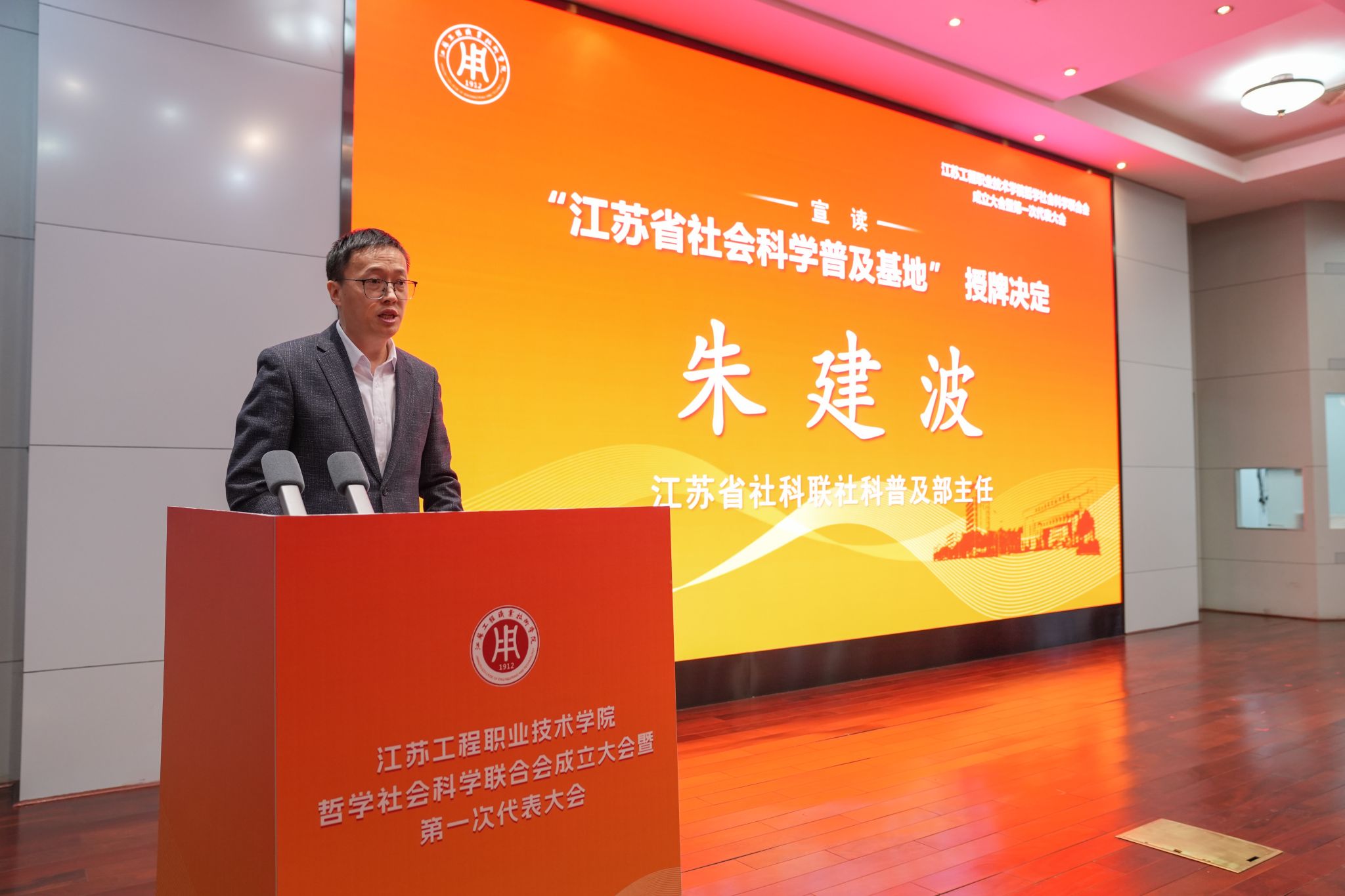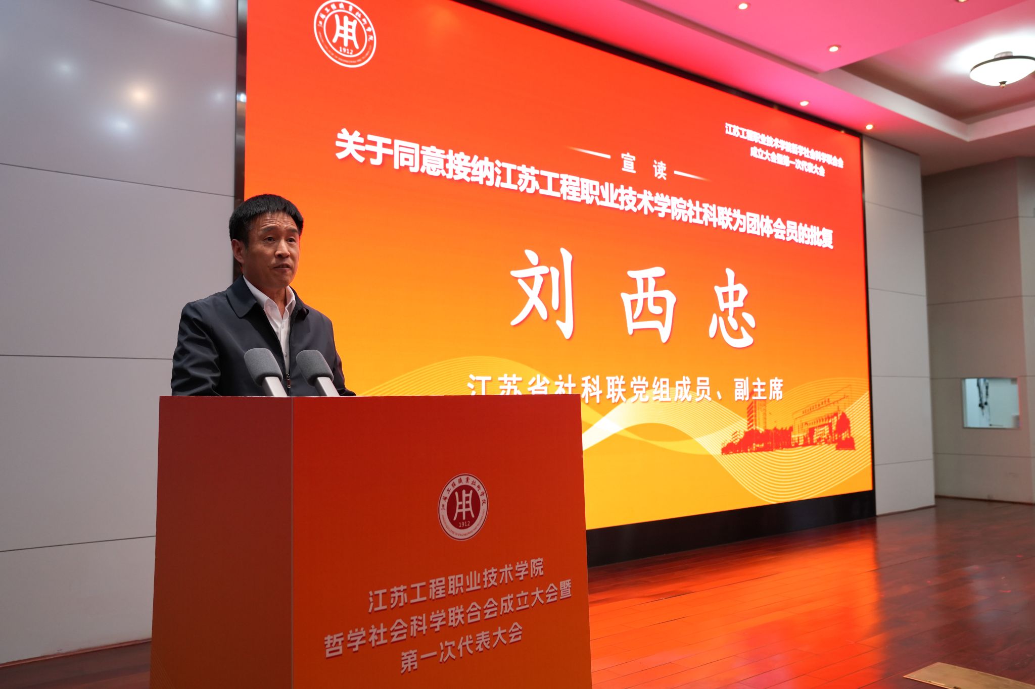 成立大会上,江苏省社科联党组成员、副主席刘西忠宣读“关于同意接纳江苏工程职业技术学院社科联为团体会员的批复”。江苏省社科联社科普及部主任朱建波宣读“江苏省社会科学普及基地”授牌决定。